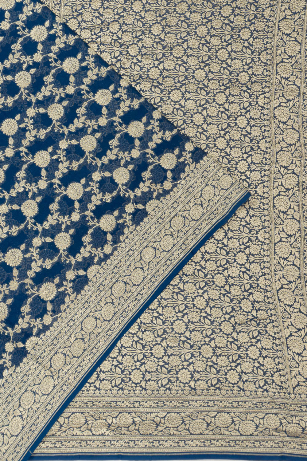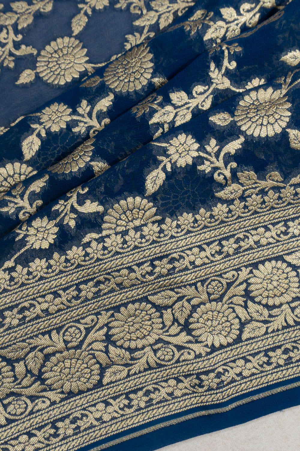 Beautiful blue georgette fabric with detailed gold zari floral brocade motifs that catch the light effortlessly.