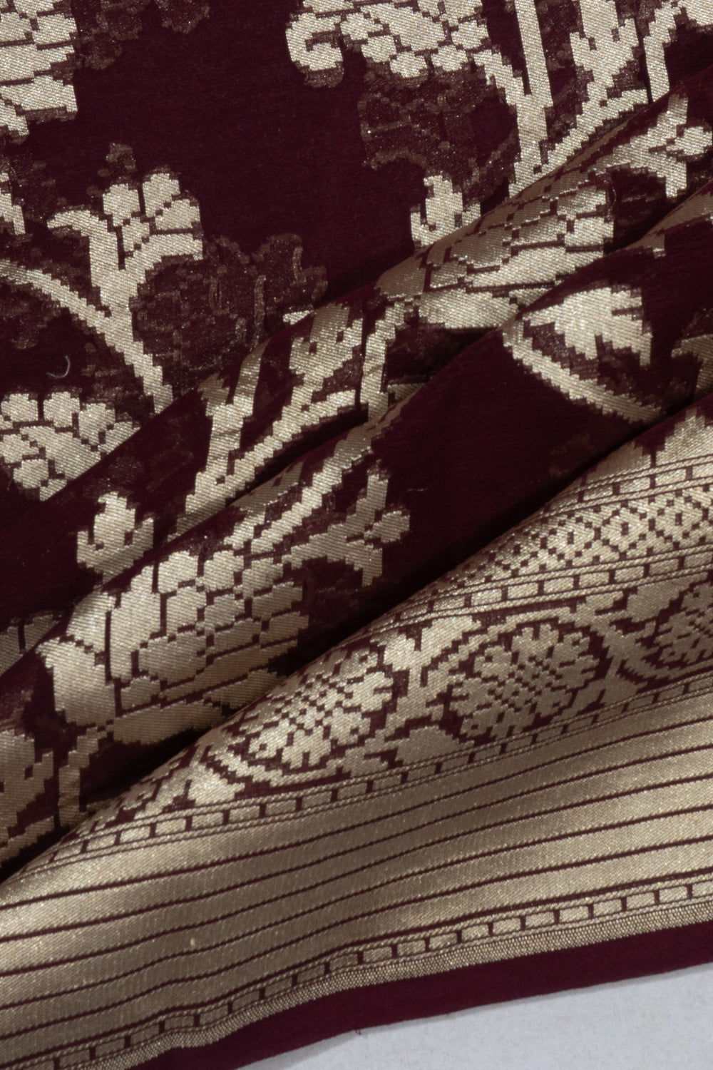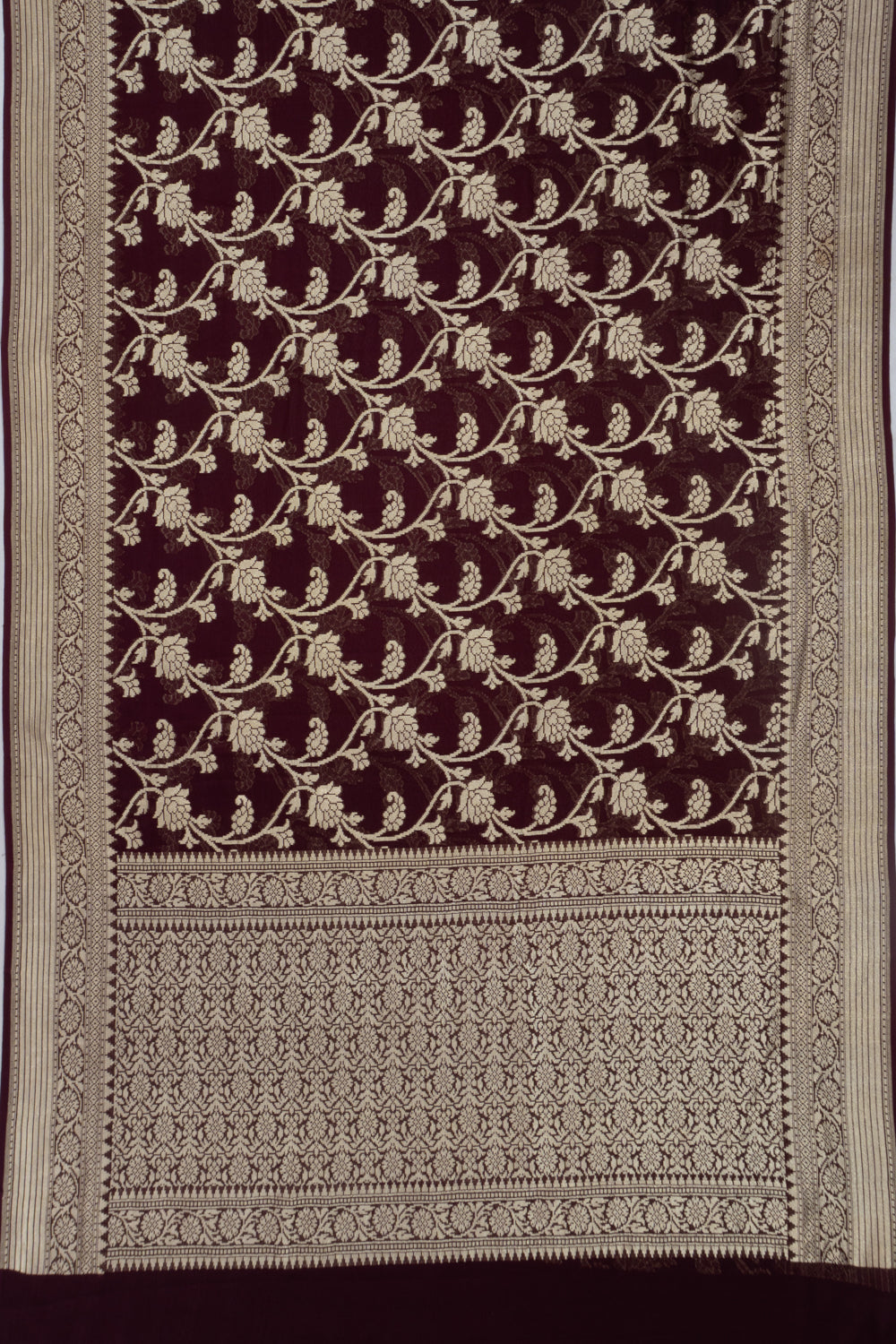 Woven in luxurious georgette the body is embellished with an all-over gold zari floral jaal offering a rich and classic Banarasi look in deep burgundy.