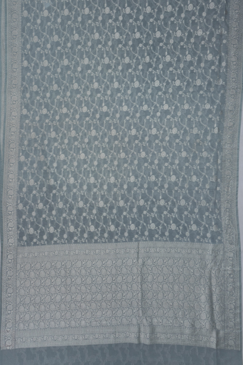 Woven in luxurious georgette the body is embellished with an all-over gold zari floral jaal offering a rich and classic Banarasi look in deep burgundy.