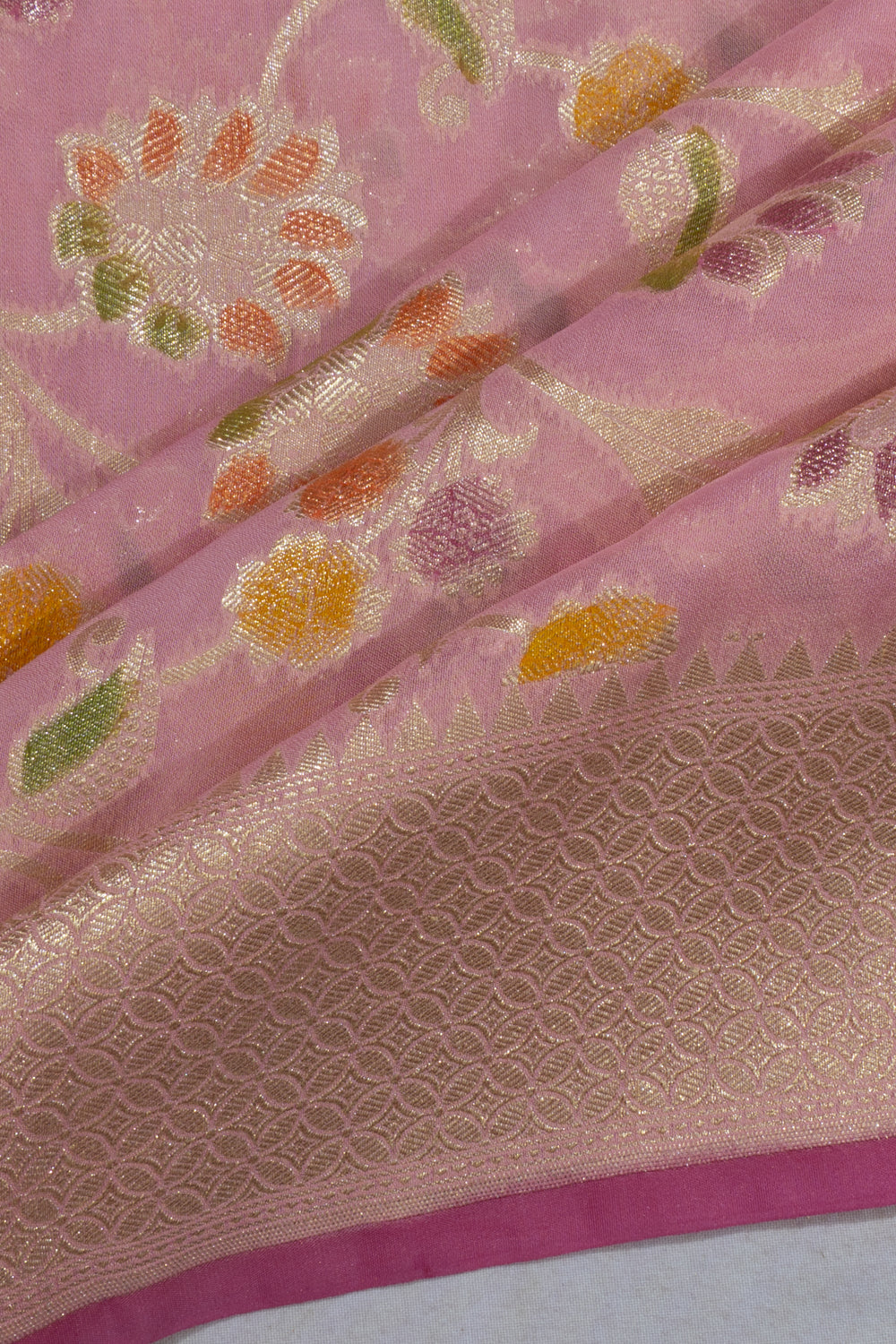 Includes a self-colored blouse with printed florals harmonizing beautifully with the saree’s motifs.