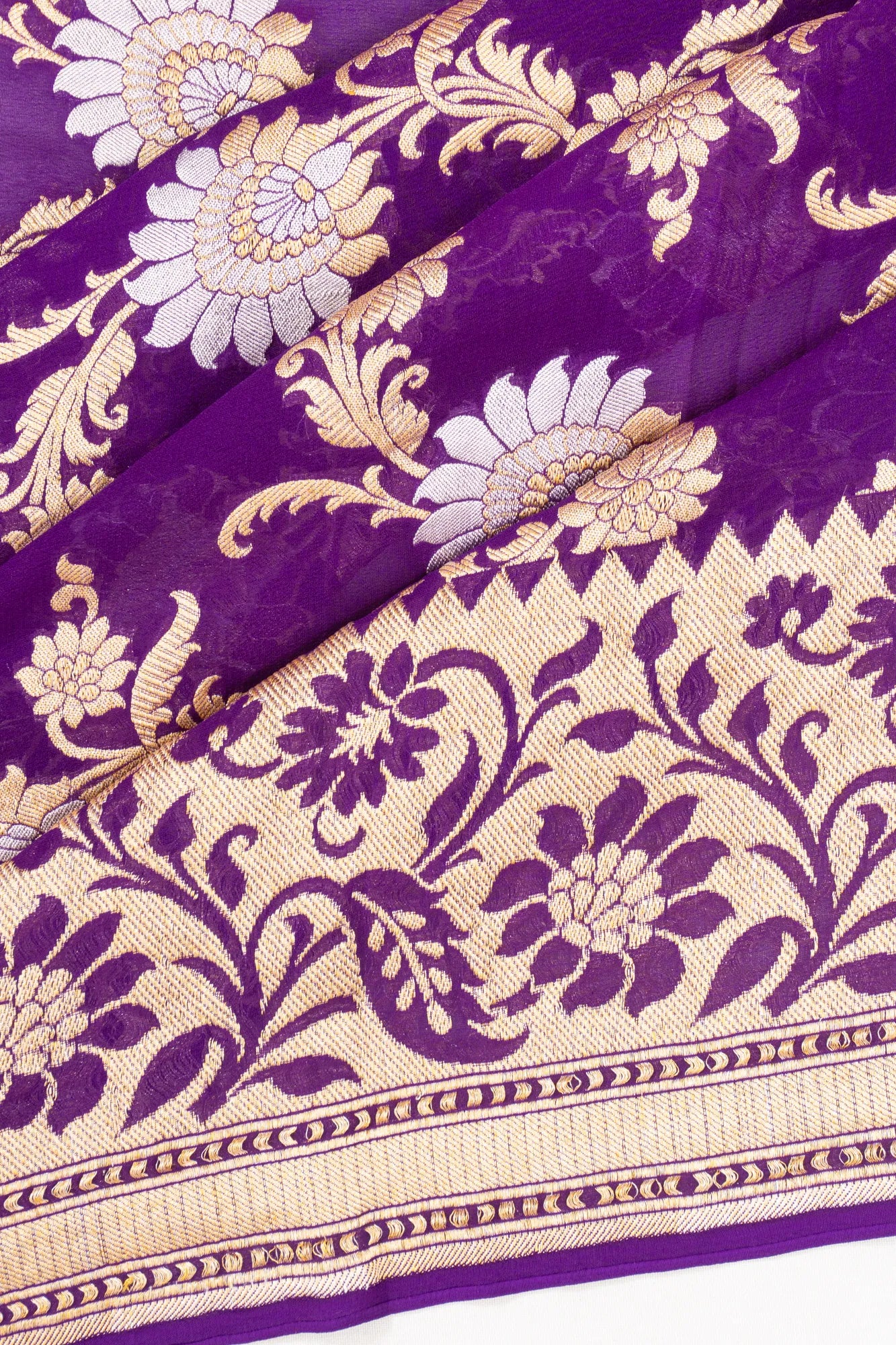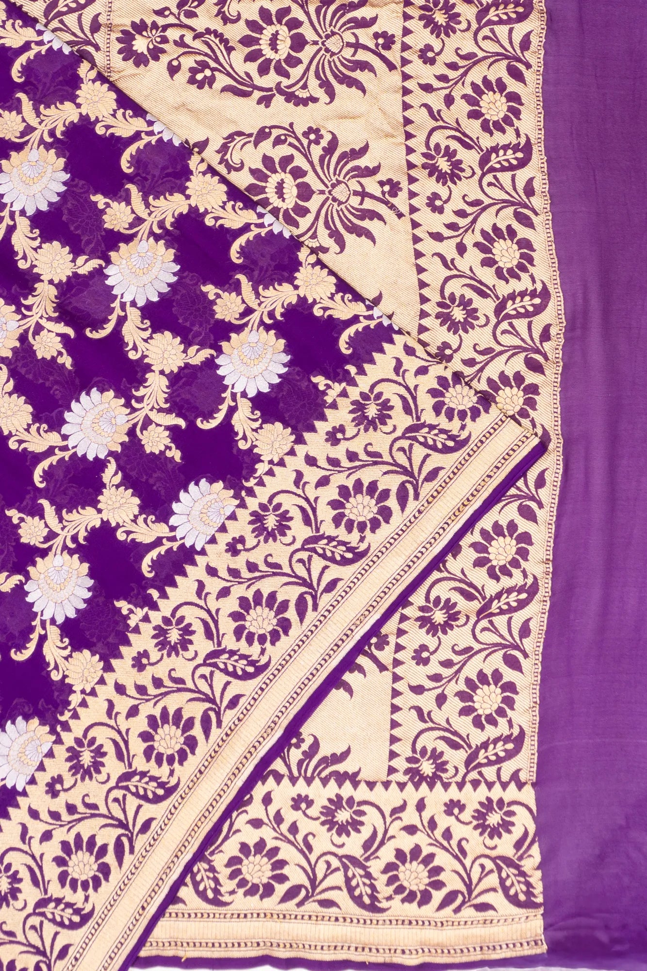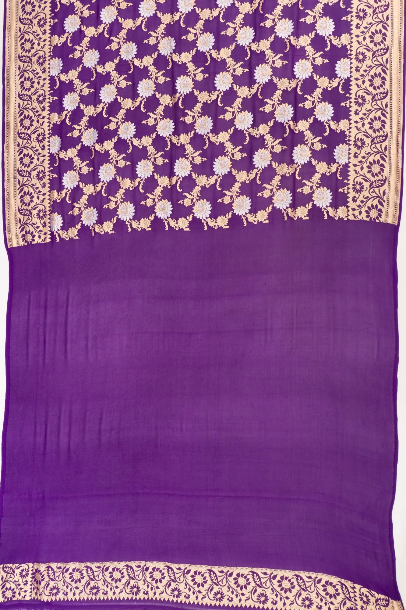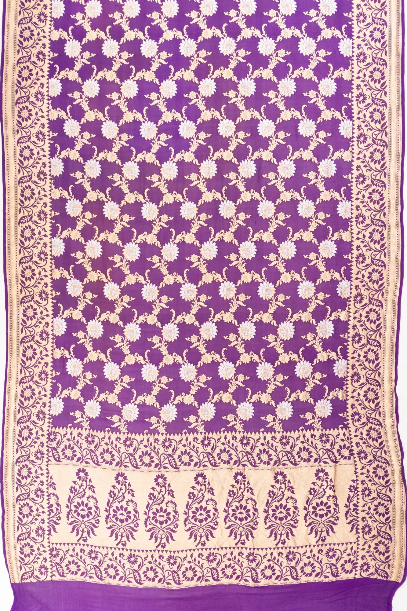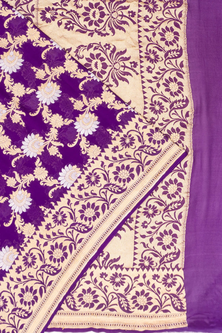A regal purple base intricately woven with an all-over floral jaal in gold and silver zari, creating a luminous and luxurious texture.