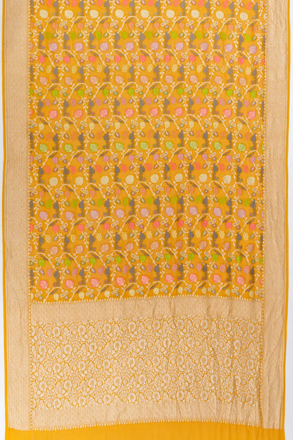 A radiant yellow base intricately woven with gold zari floral jaal highlighted by multicolour meenakari, creating a vibrant and festive appeal.