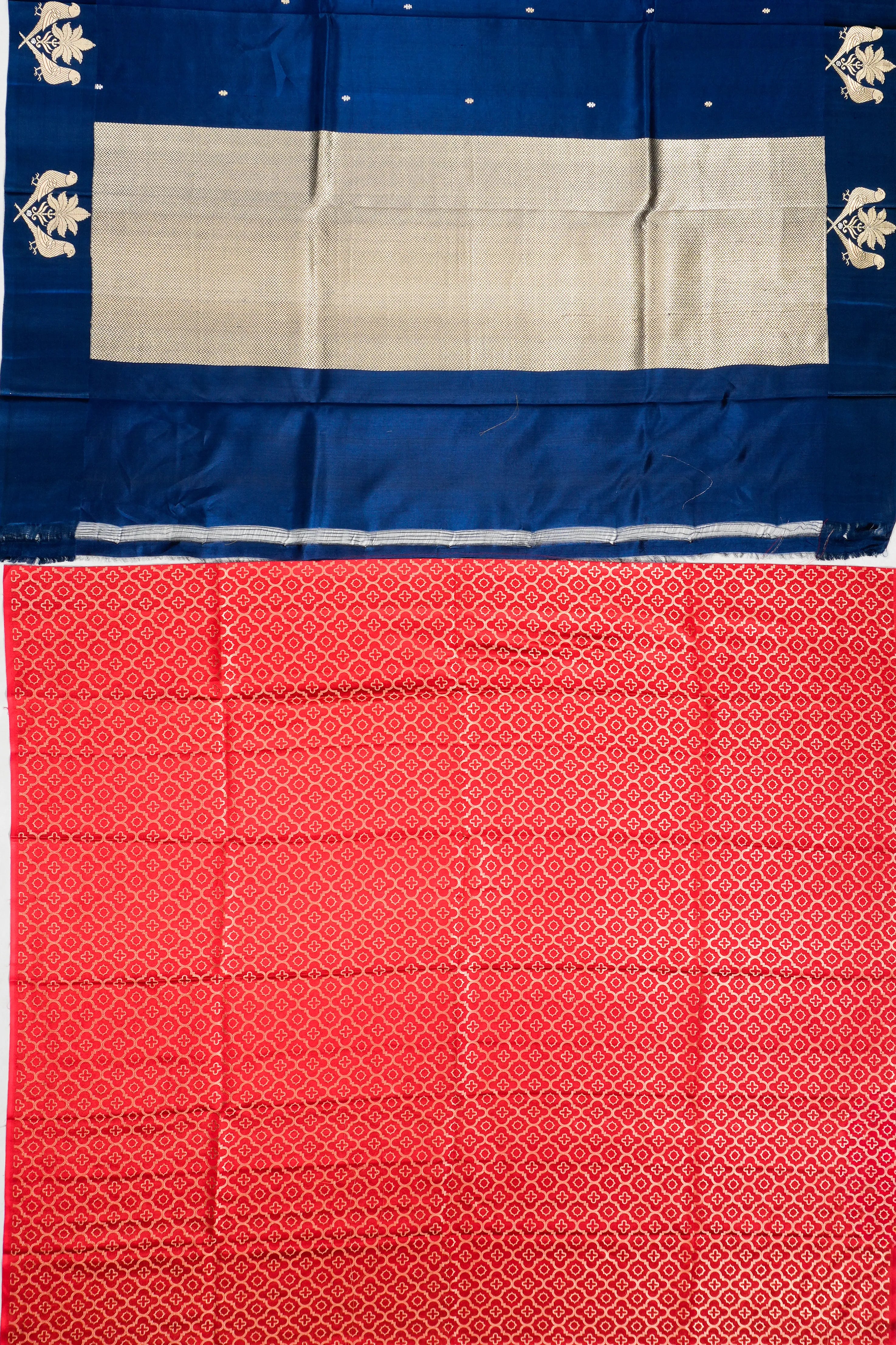 A coordinated contrast red blouse, embellished with gold zari floral brocade, completes this exquisite ensemble