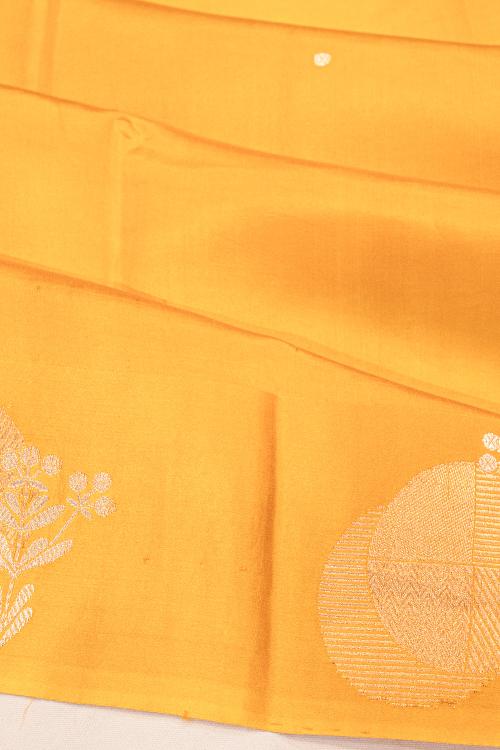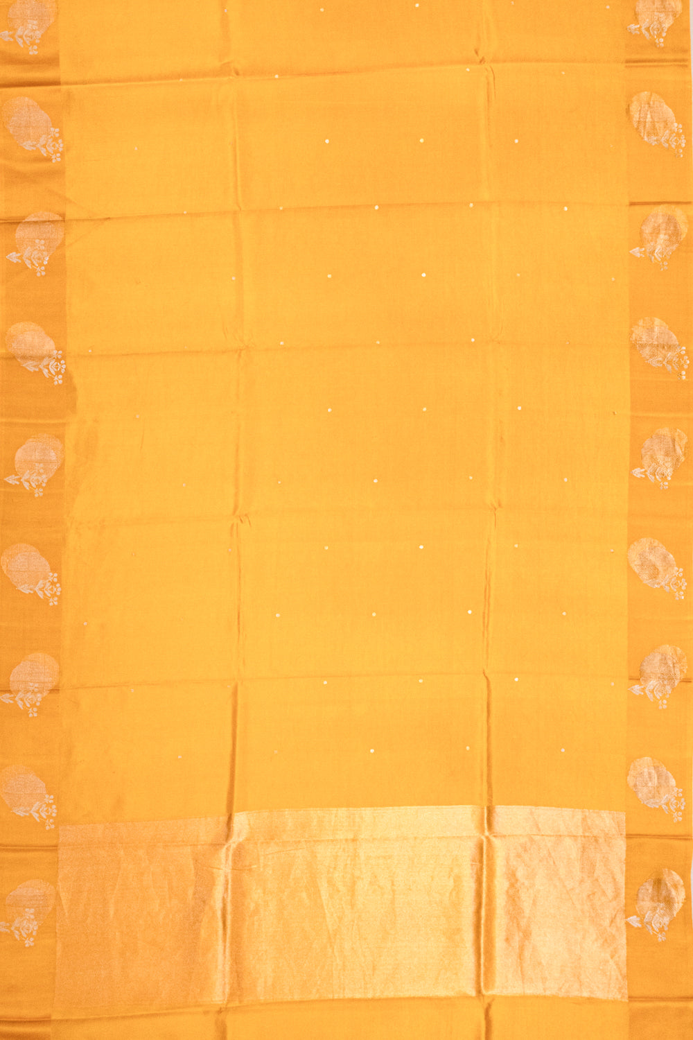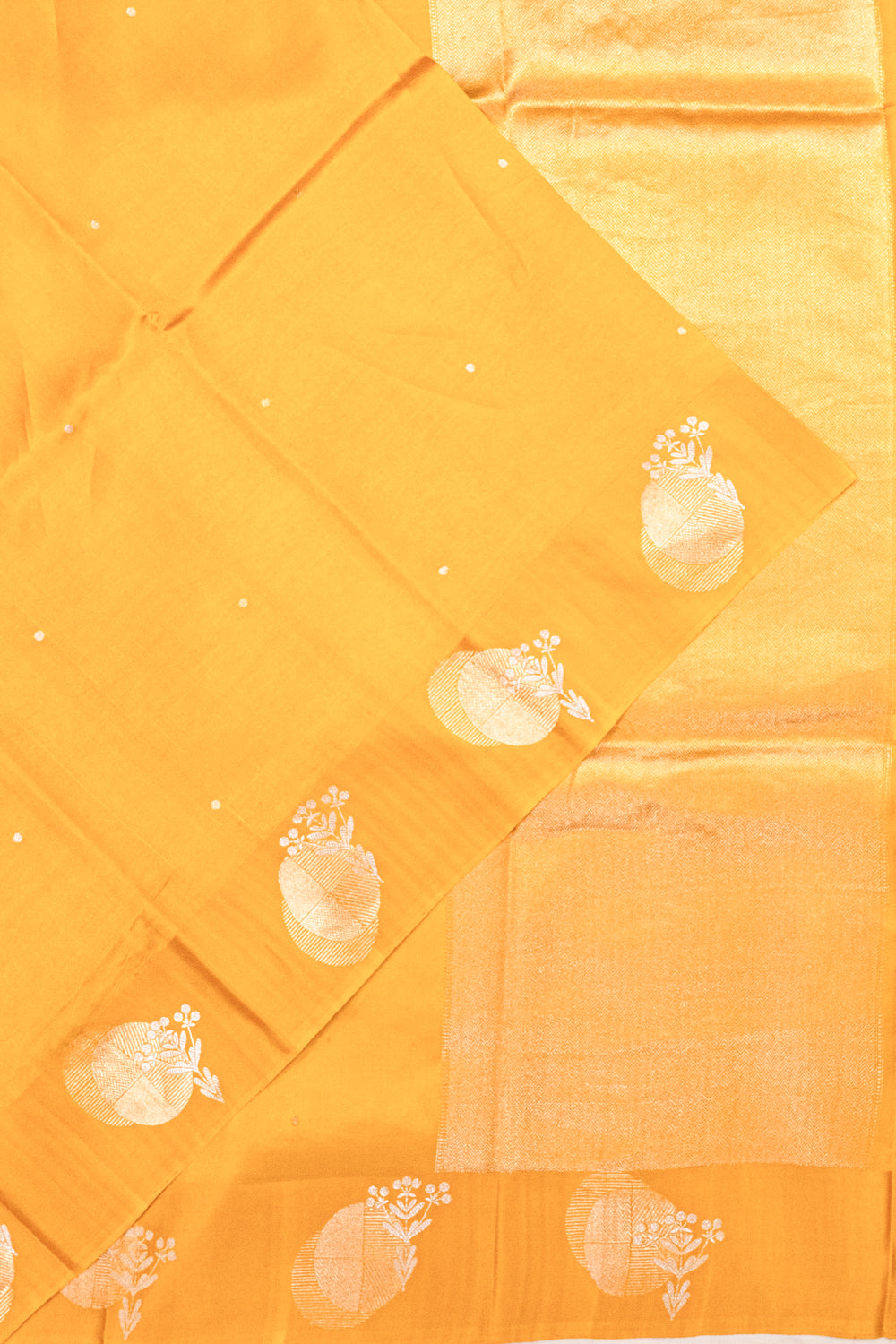 Embrace the allure of tradition with this Banarasi Katan Silk Butta Yellow Saree, a masterpiece of heritage-rich craftsmanship The body is adorned with exquisite gold and silver zari polka dot buttas, offering a subtle yet luxurious shimmer that speaks of timeless elegance