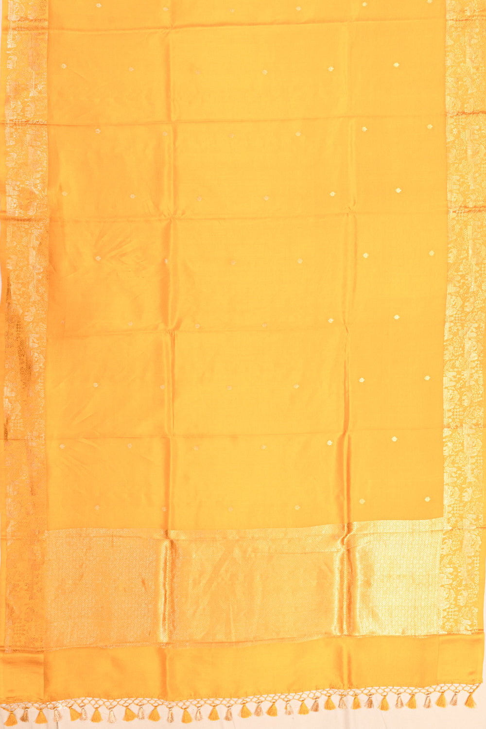 The saree's body is adorned with exquisite gold zari floral buttas, exuding elegance and grace with every fold