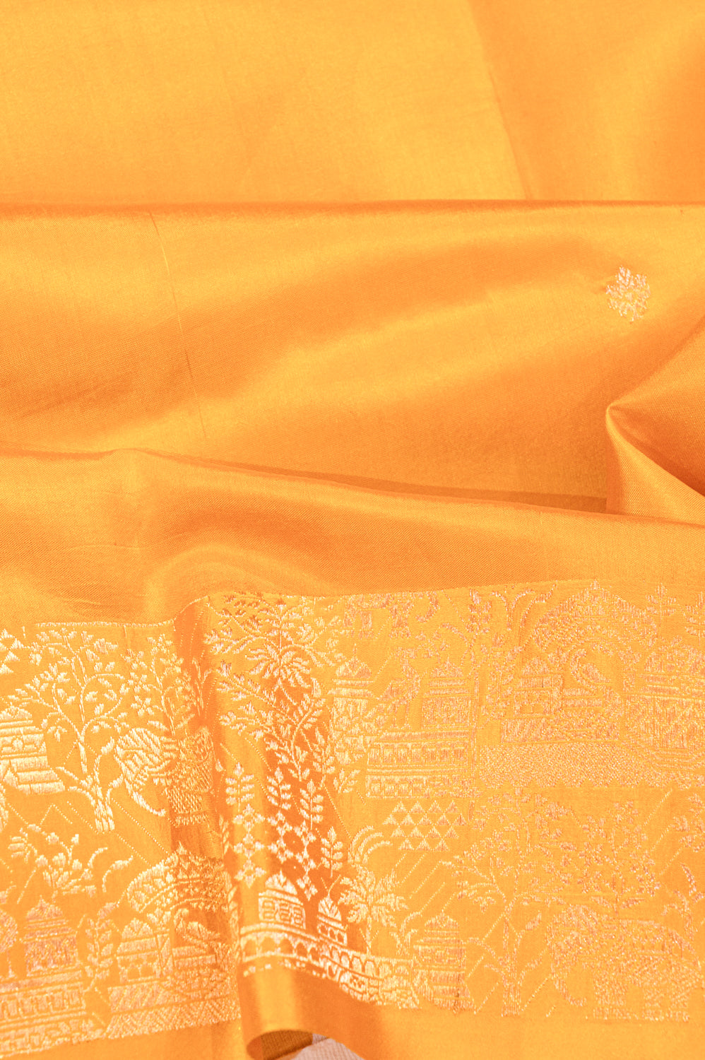A small border of self gold zari brings opulence with intricate bird and elephant motifs in a floral brocade design