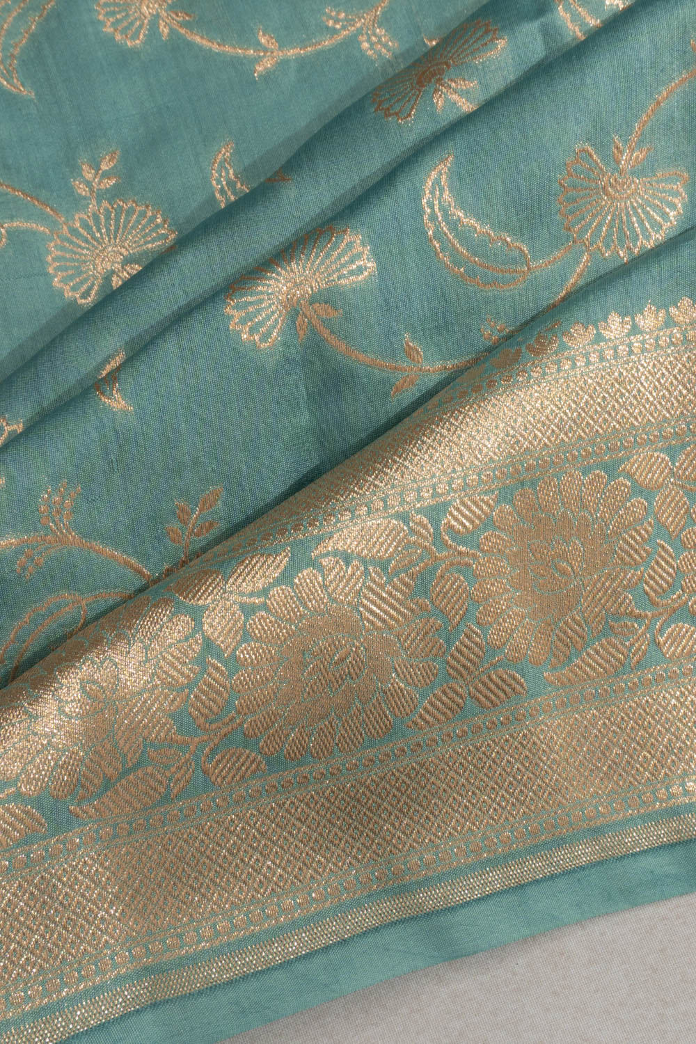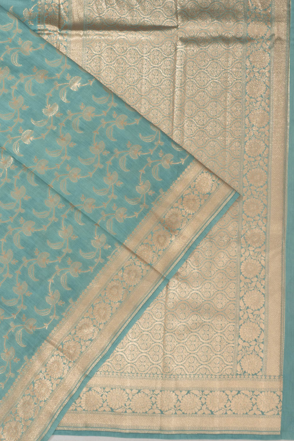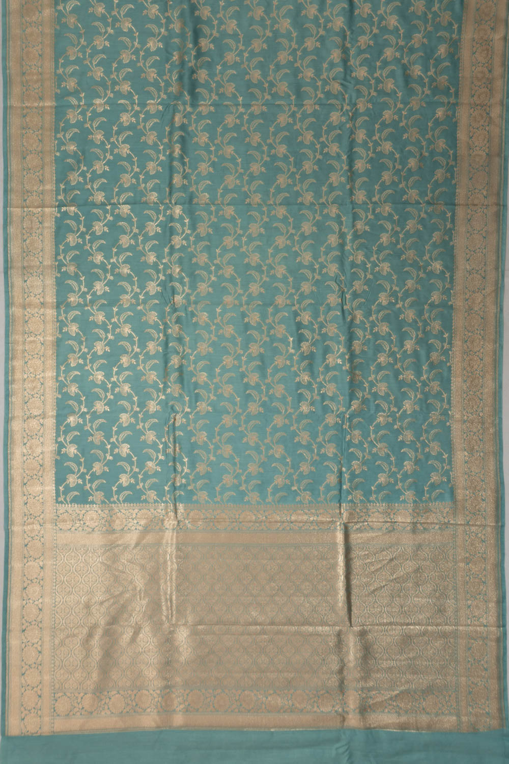 Soft pastel blue katan silk adorned with intricate gold zari floral jaal, offering a refined and elegant texture.