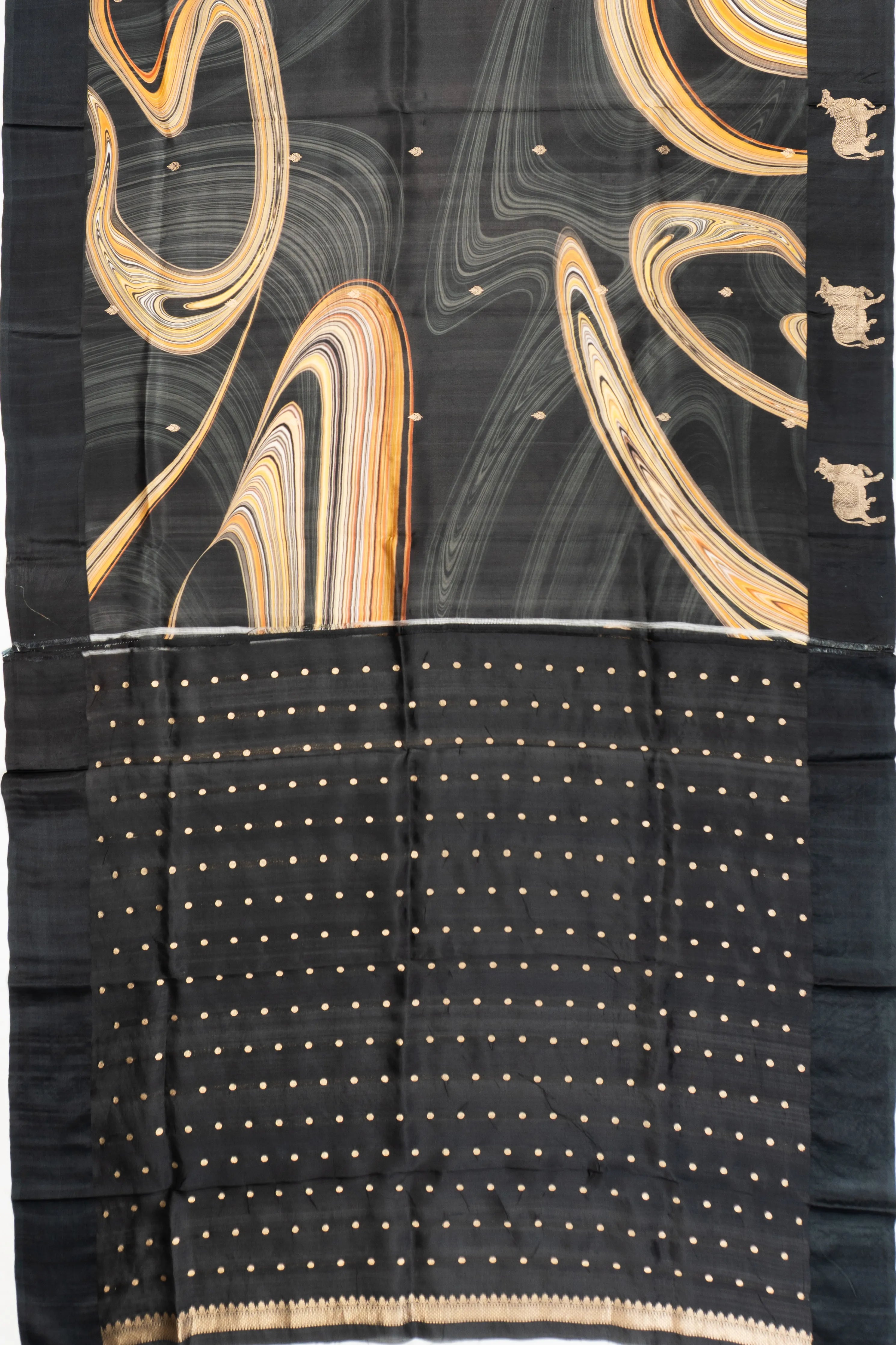 A self gold zari border featuring intricate pichwai motifs adds a touch of grandeur, creating a harmonious blend of artistry and sophistication