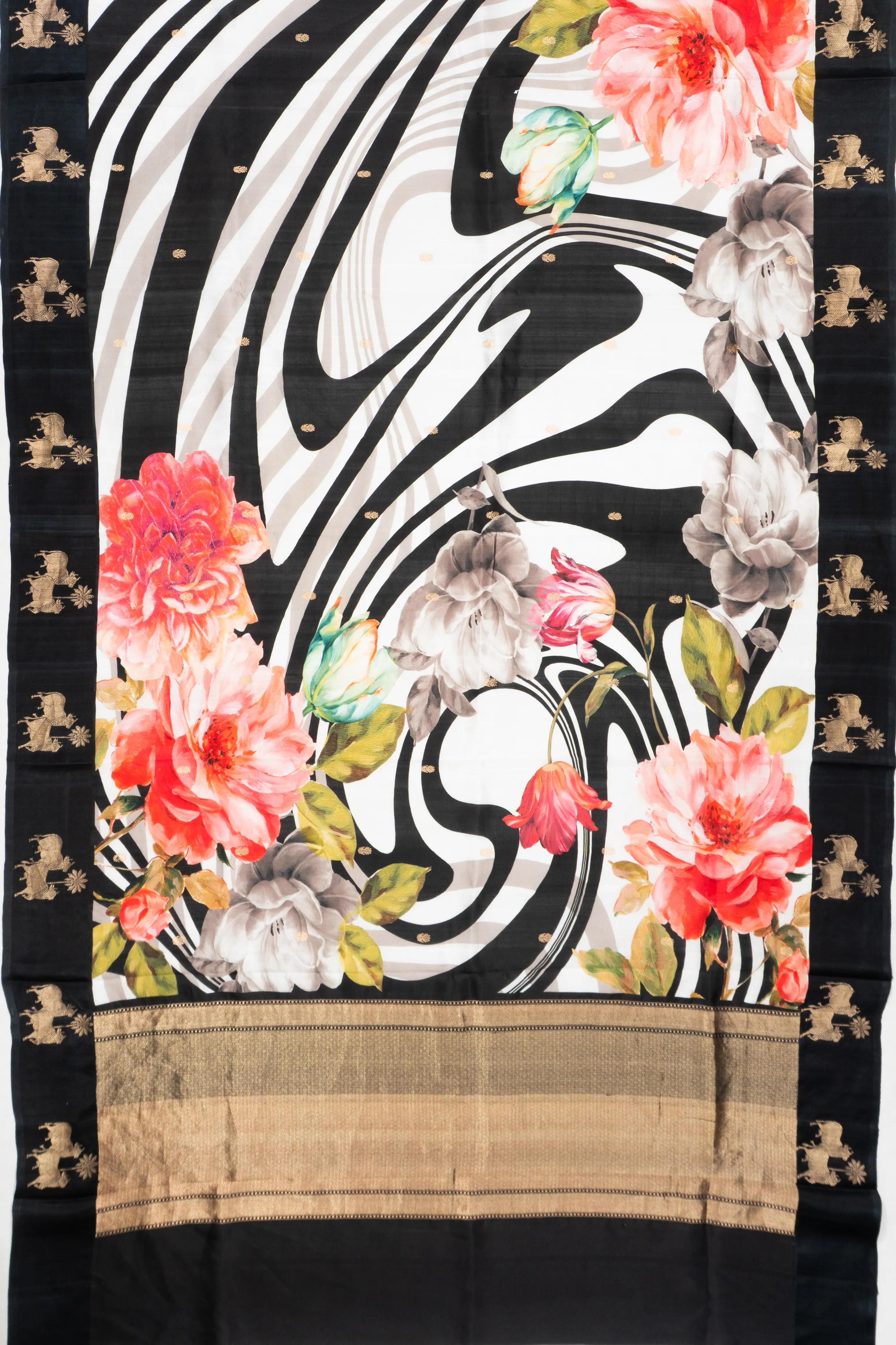 The saree's body is beautifully adorned with gold zari floral butta and exquisite prints, creating a visual symphony of luxury and tradition