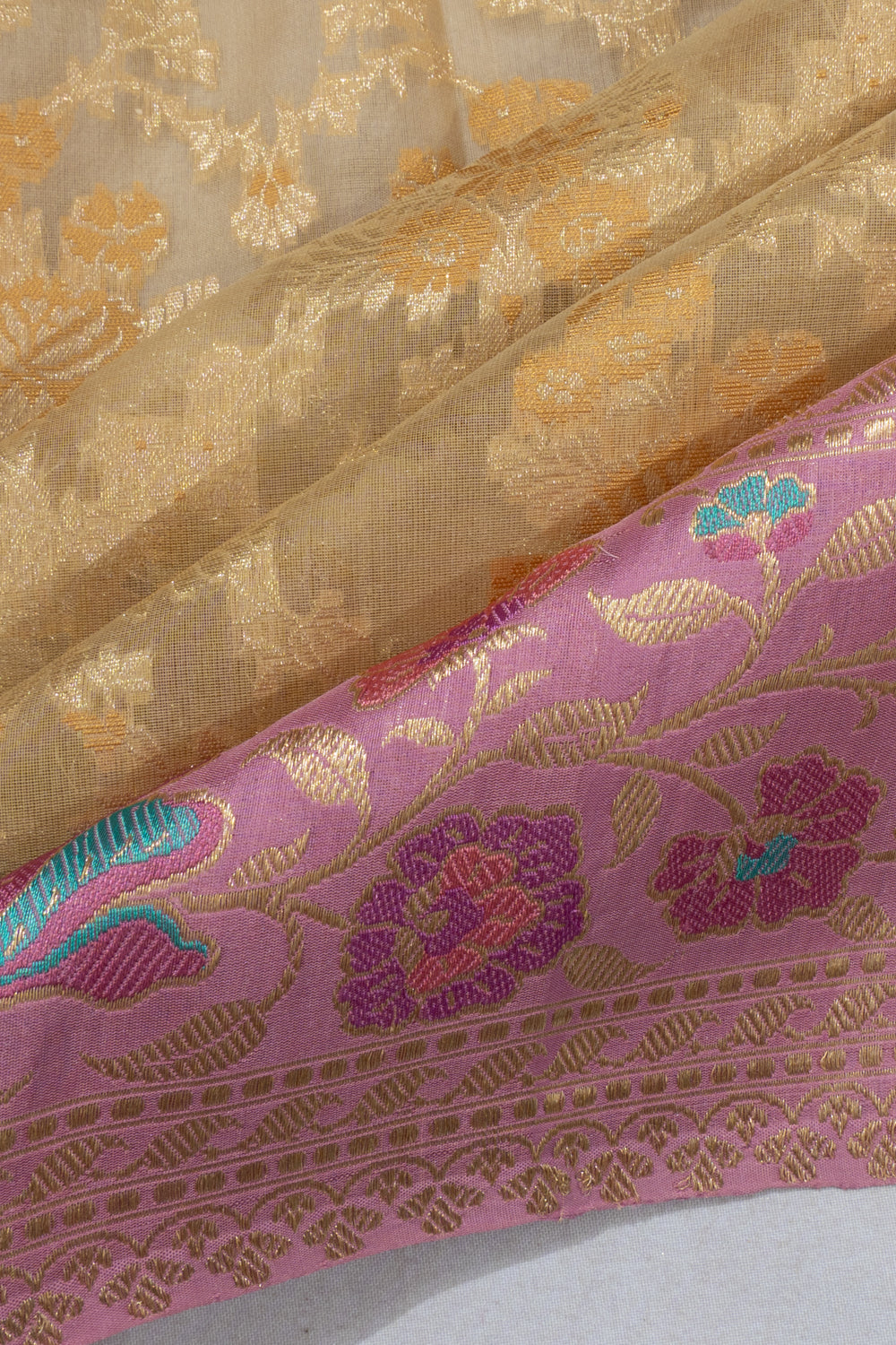 A medium contrast pink border woven with gold zari floral brocade, adding color and depth to the lightweight drape.