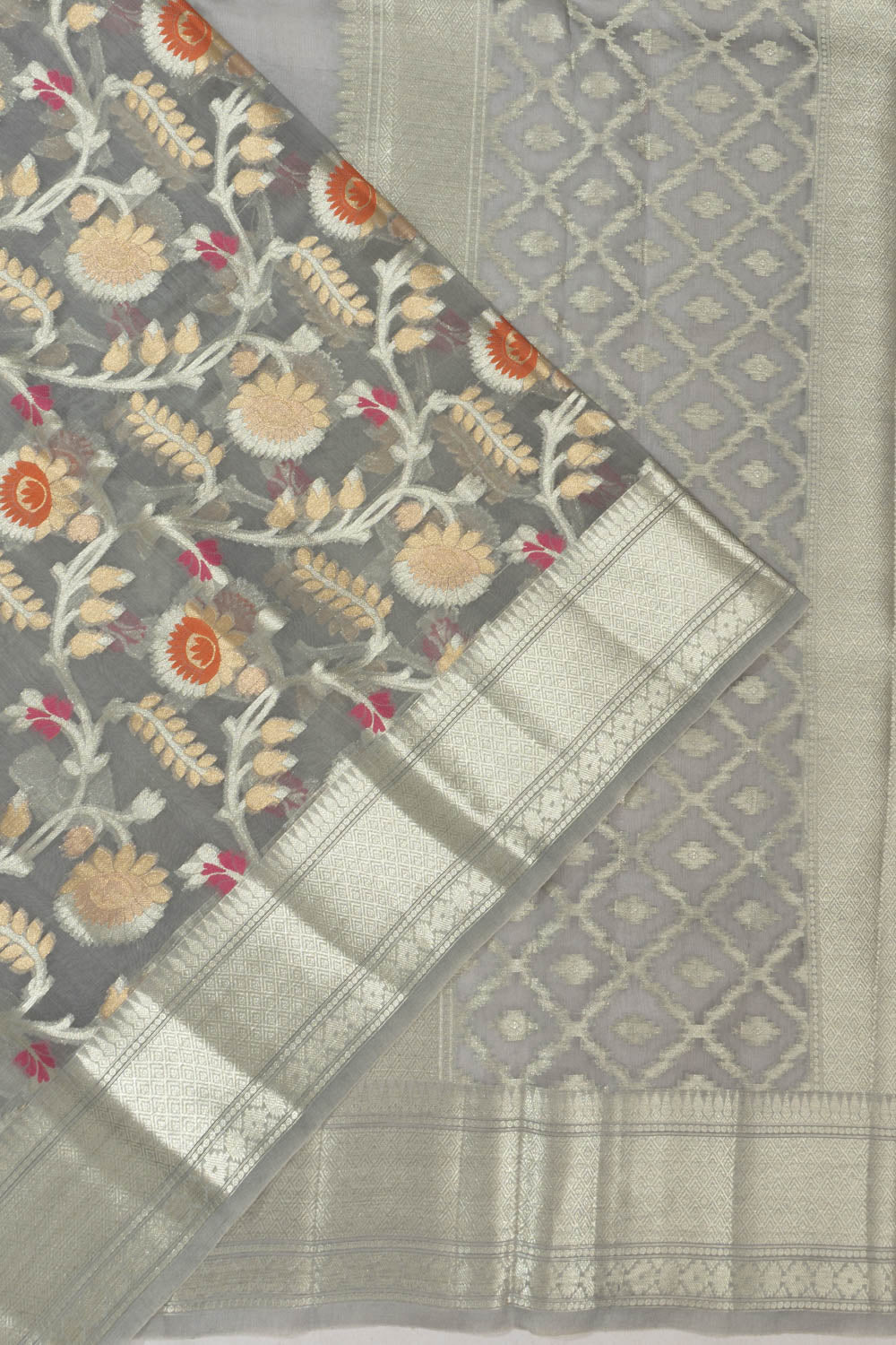 Grey Kora organza with silver zari floral brocade, offering a refined, shimmering base with delicate patterns.