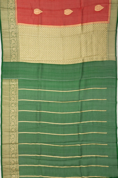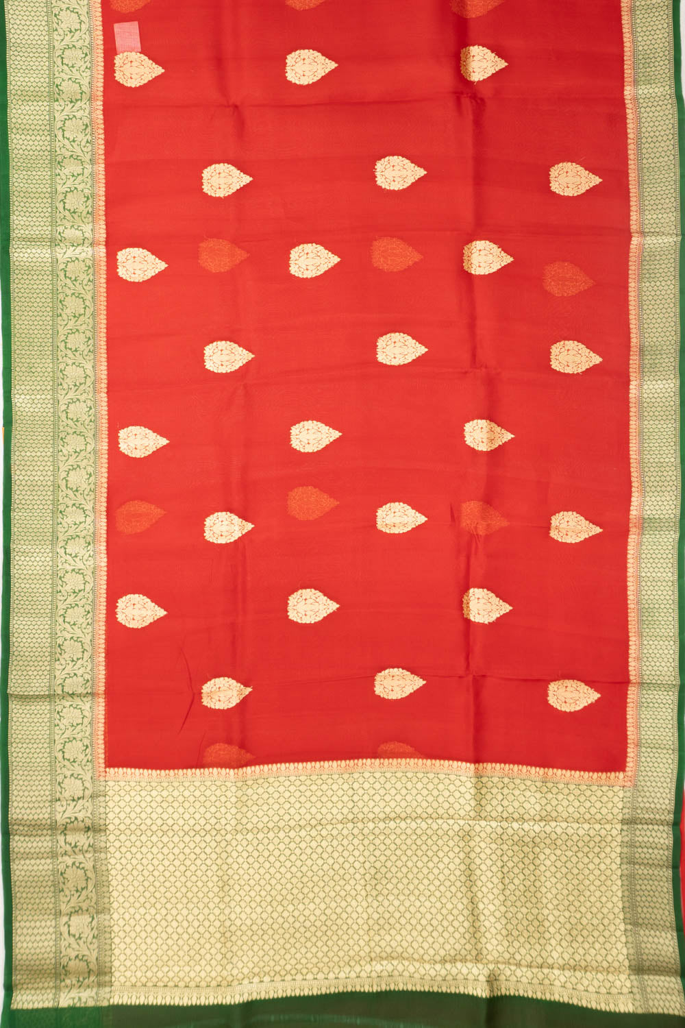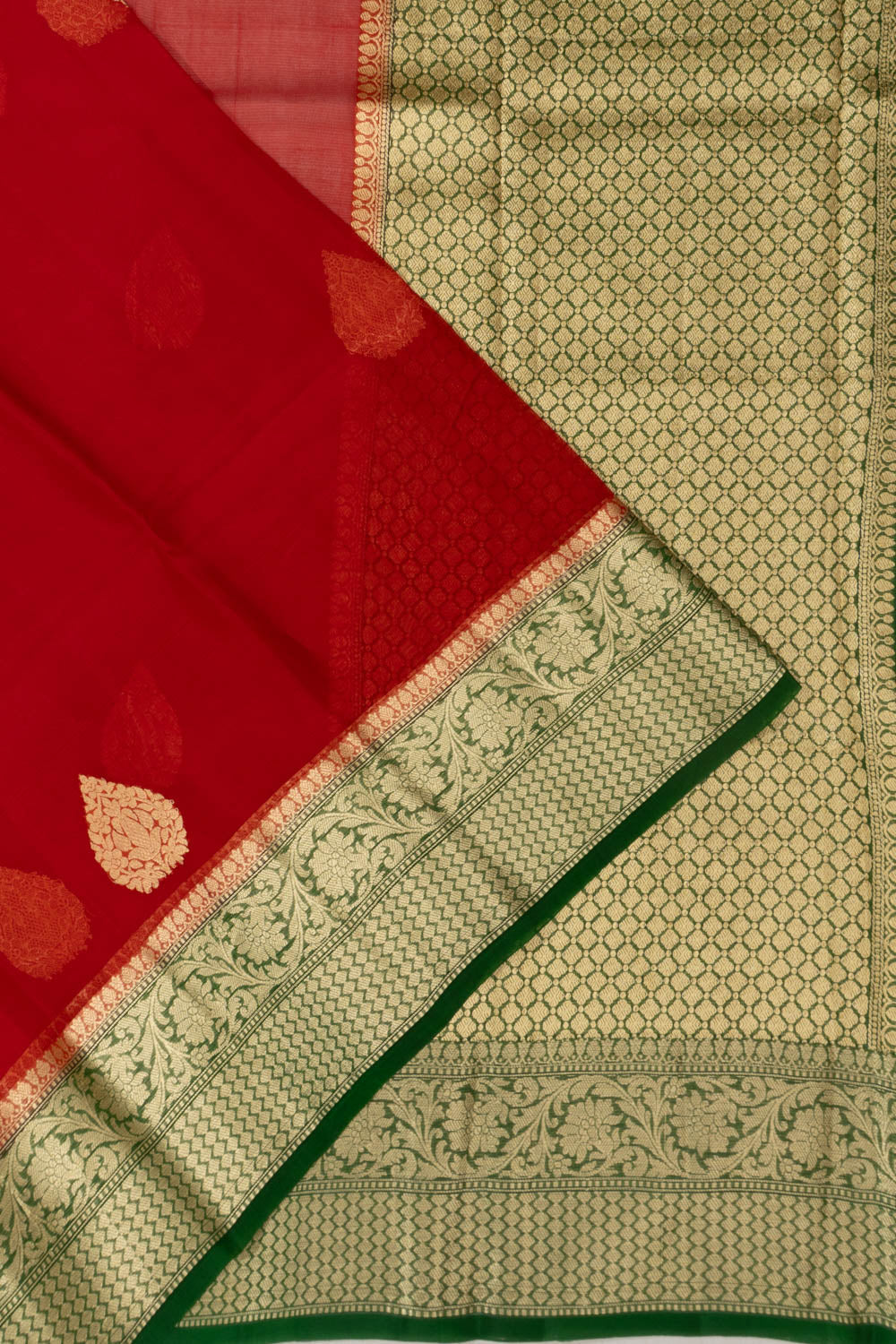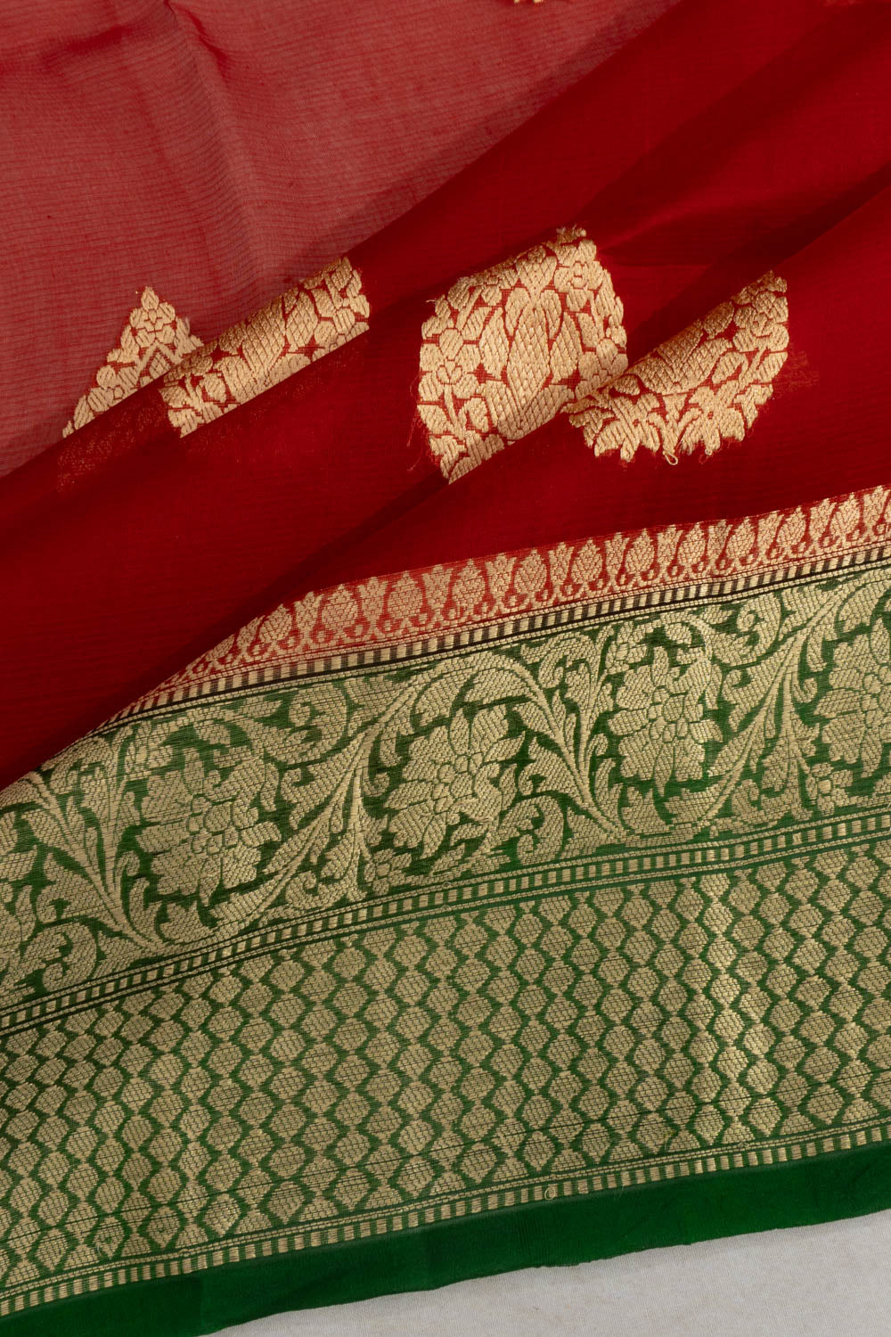 Rich red Kora organza fabric adorned with gold zari floral buttas, giving a luxurious and traditional look.