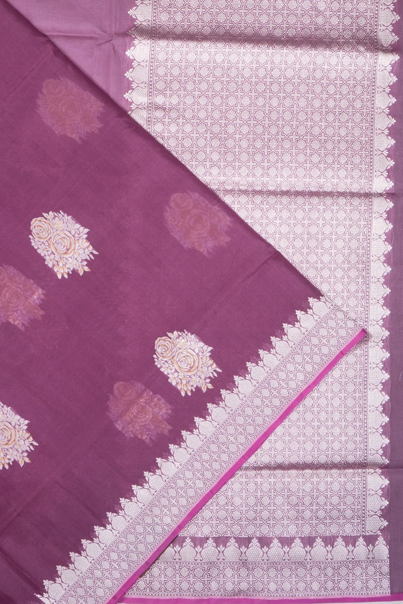 This saree's body is adorned with exquisite silver zari floral buttas, creating a delicate dance of shimmer against the soft violet backdrop