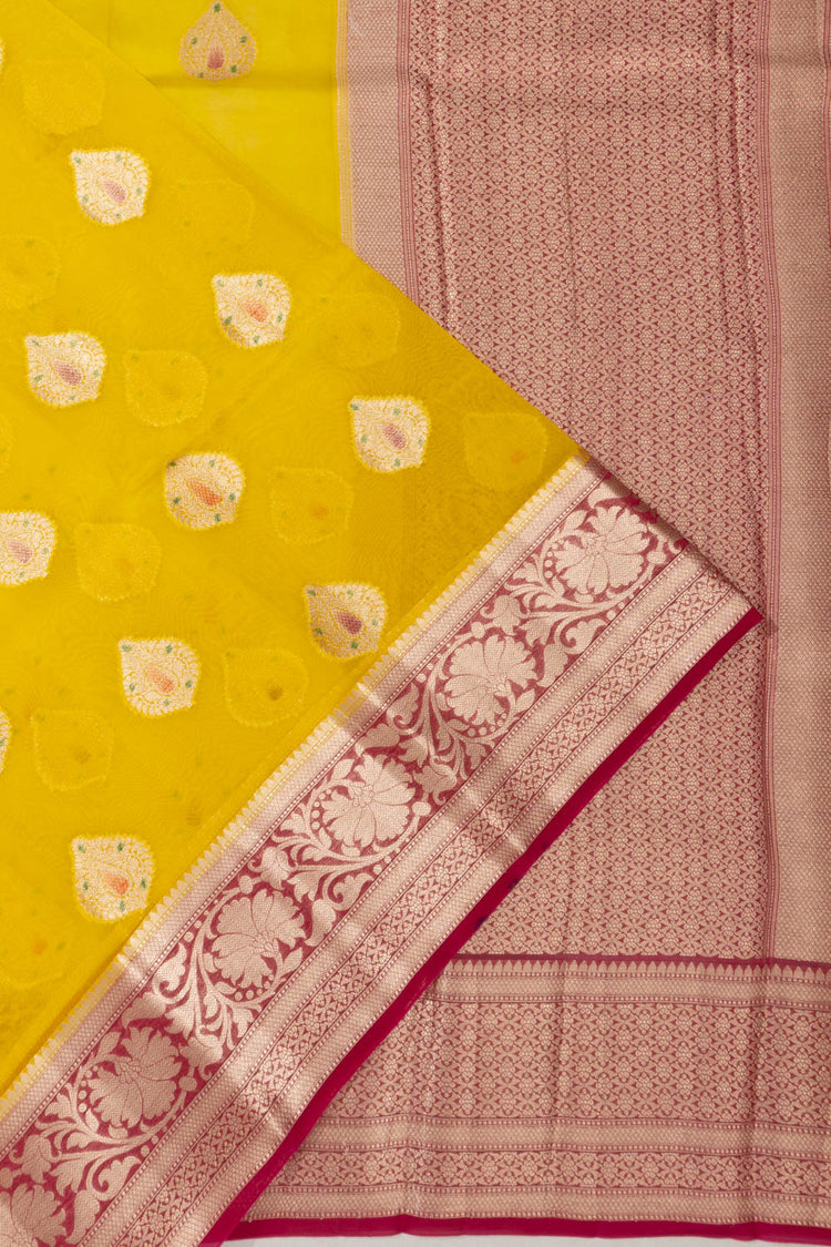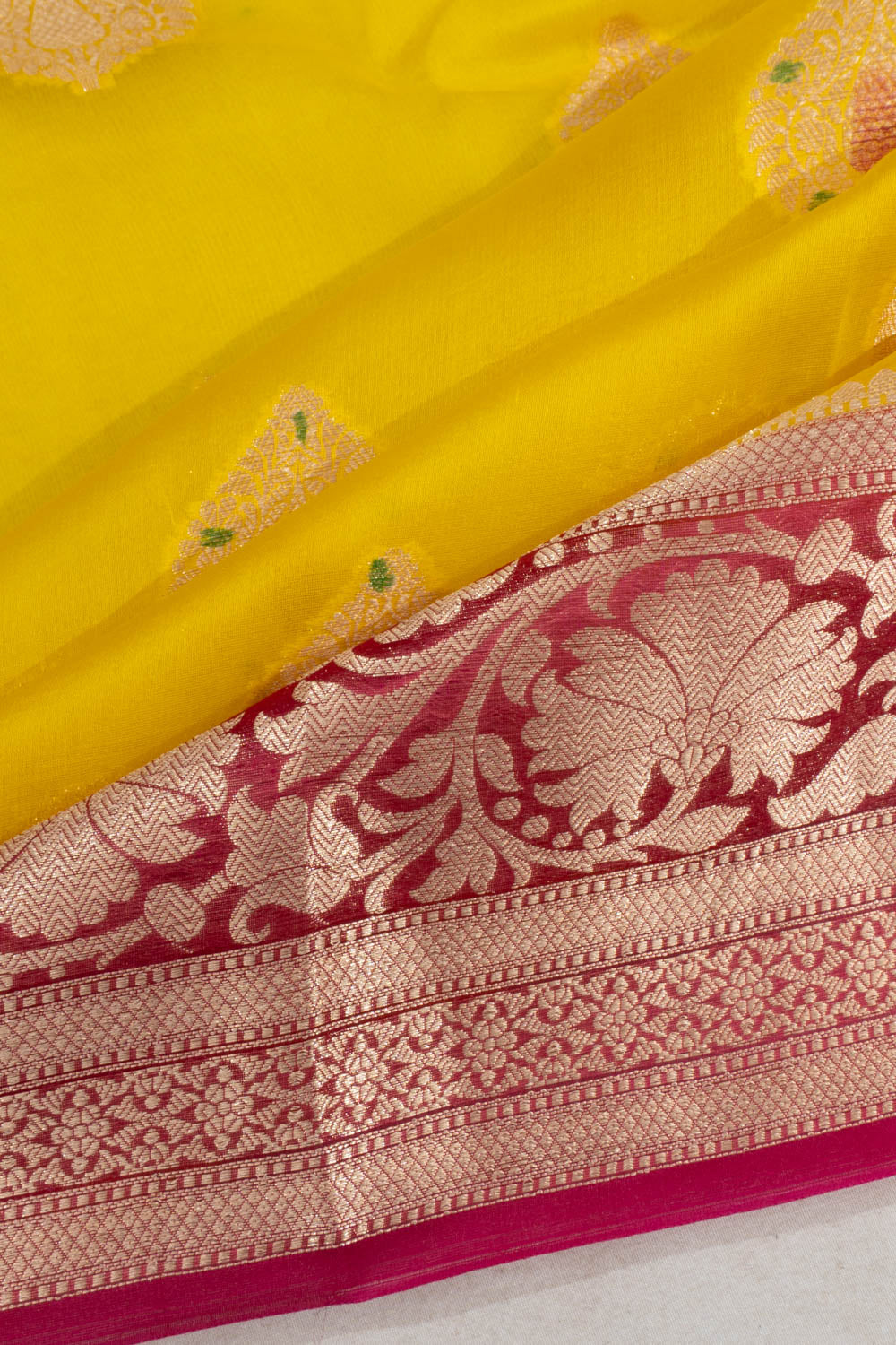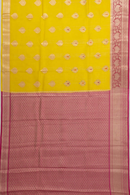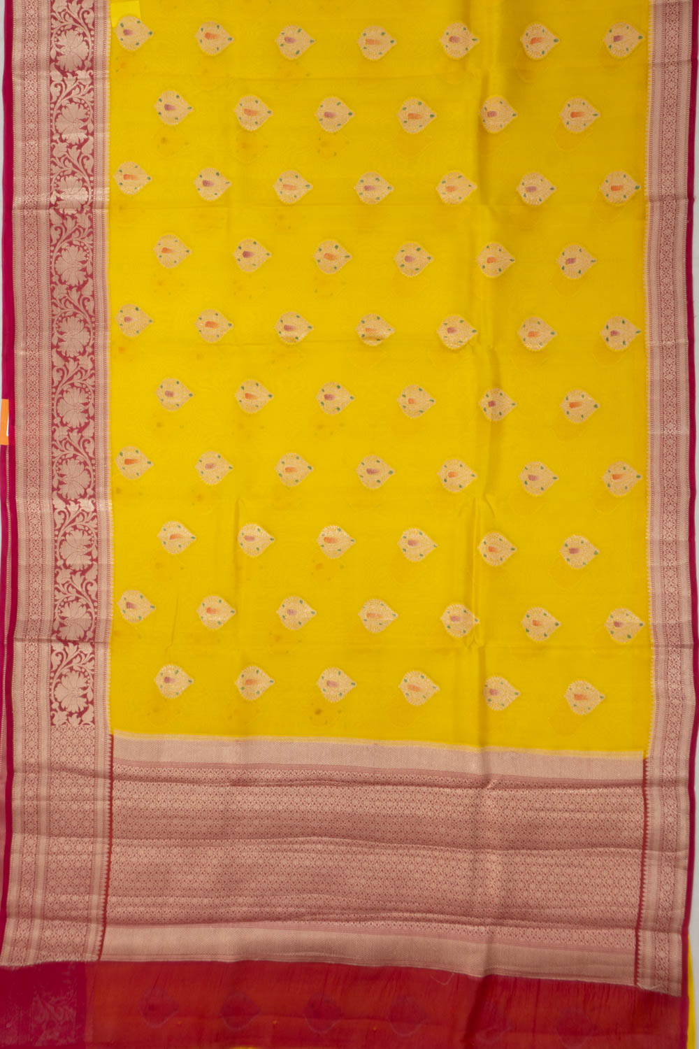 Yellow Kora organza with gold zari floral butta, featuring delicate floral motifs woven in shimmering gold zari.