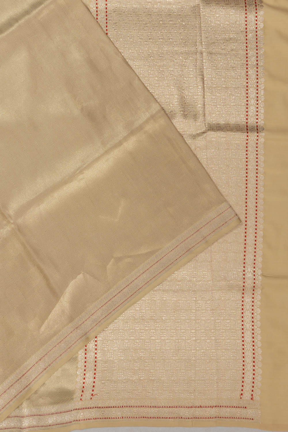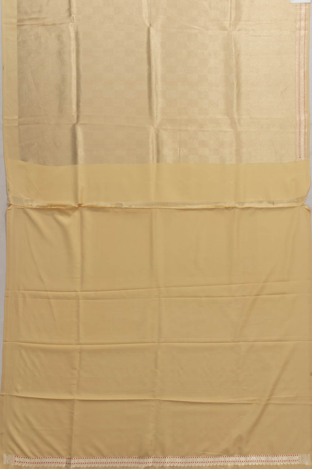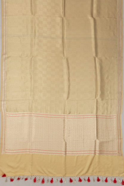The self gold zari geometrical brocade pallu, completed with decorative tassels, provides a sophisticated finish with its unique pattern.