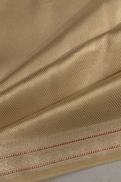Crafted with gold zari, the saree showcases a stunning geometrical brocade, adding depth and texture to the fabric.