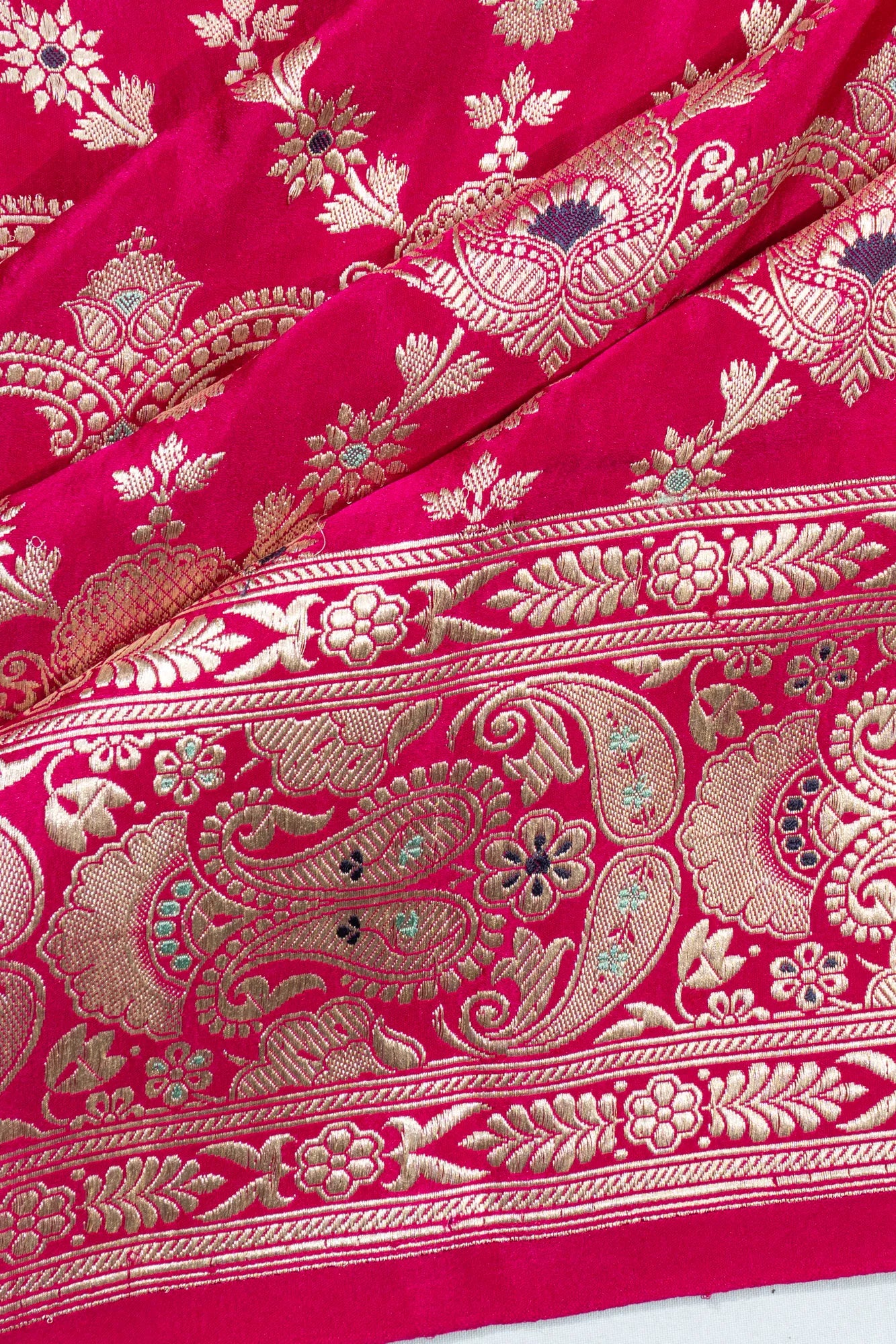 The body of the saree is adorned with a luxurious gold zari floral brocade, accented with delicate meenakari work, offering a stunning display of traditional artistry