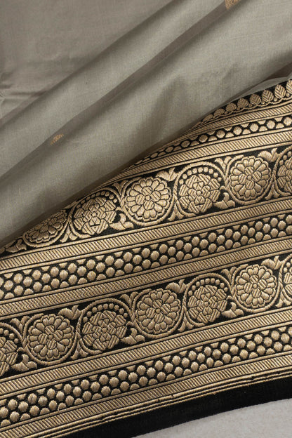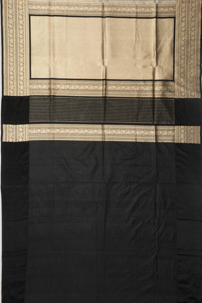 Features a contrast gold zari black border, adorned with floral vine motifs for a striking and elegant contrast.