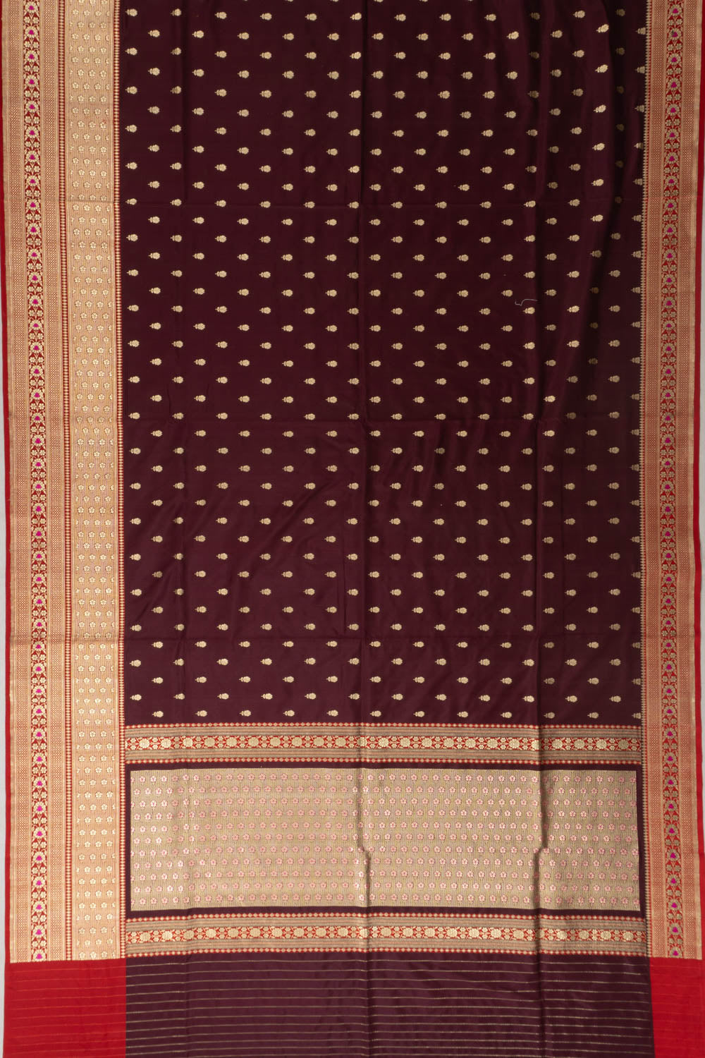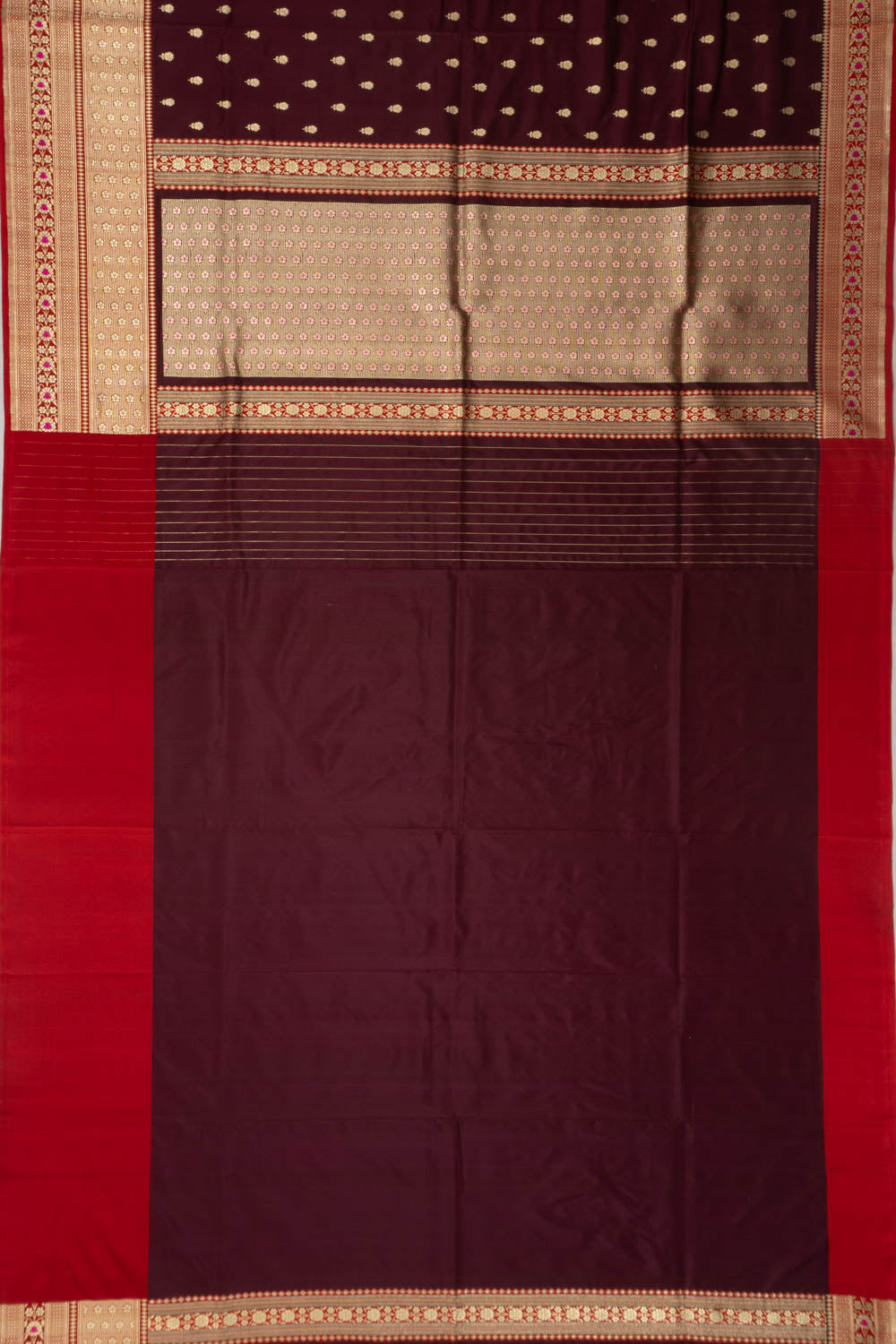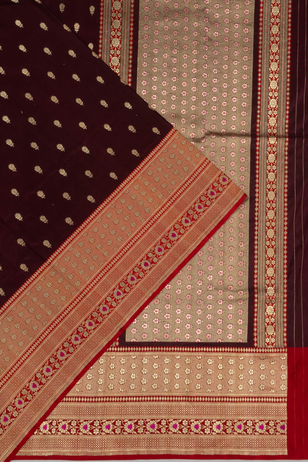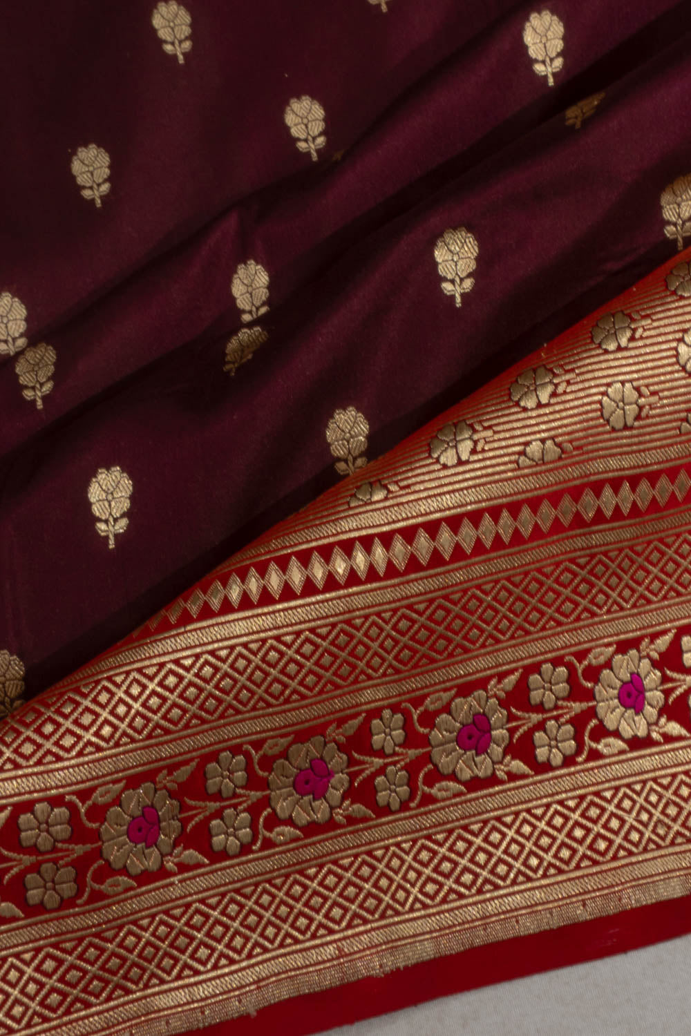 The contrast gold zari floral brocade pallu adds a luxurious finish, enhancing the saree’s traditional appeal with intricate floral patterns.