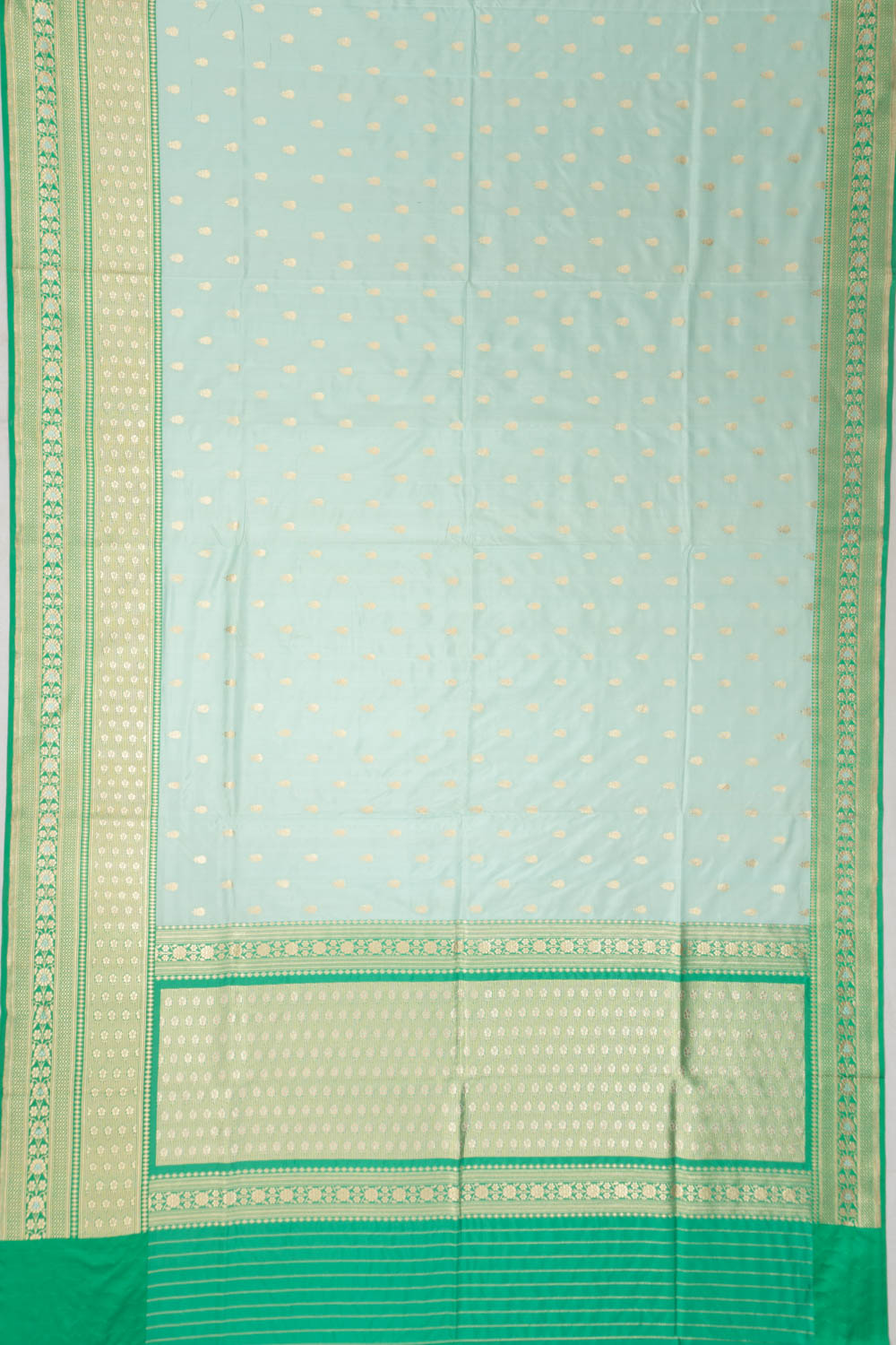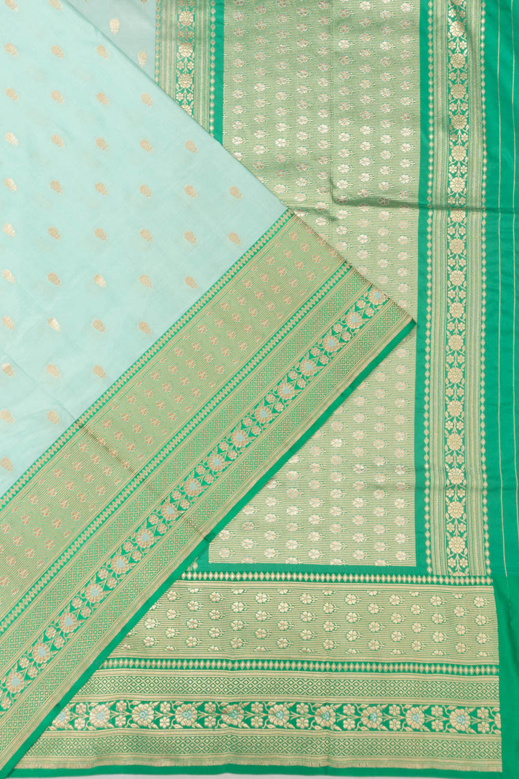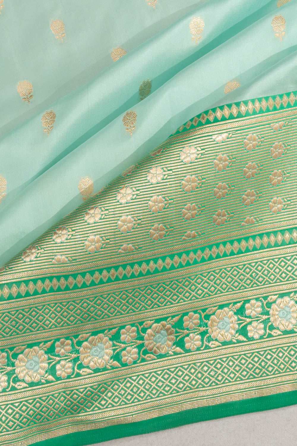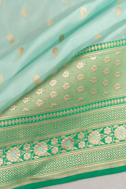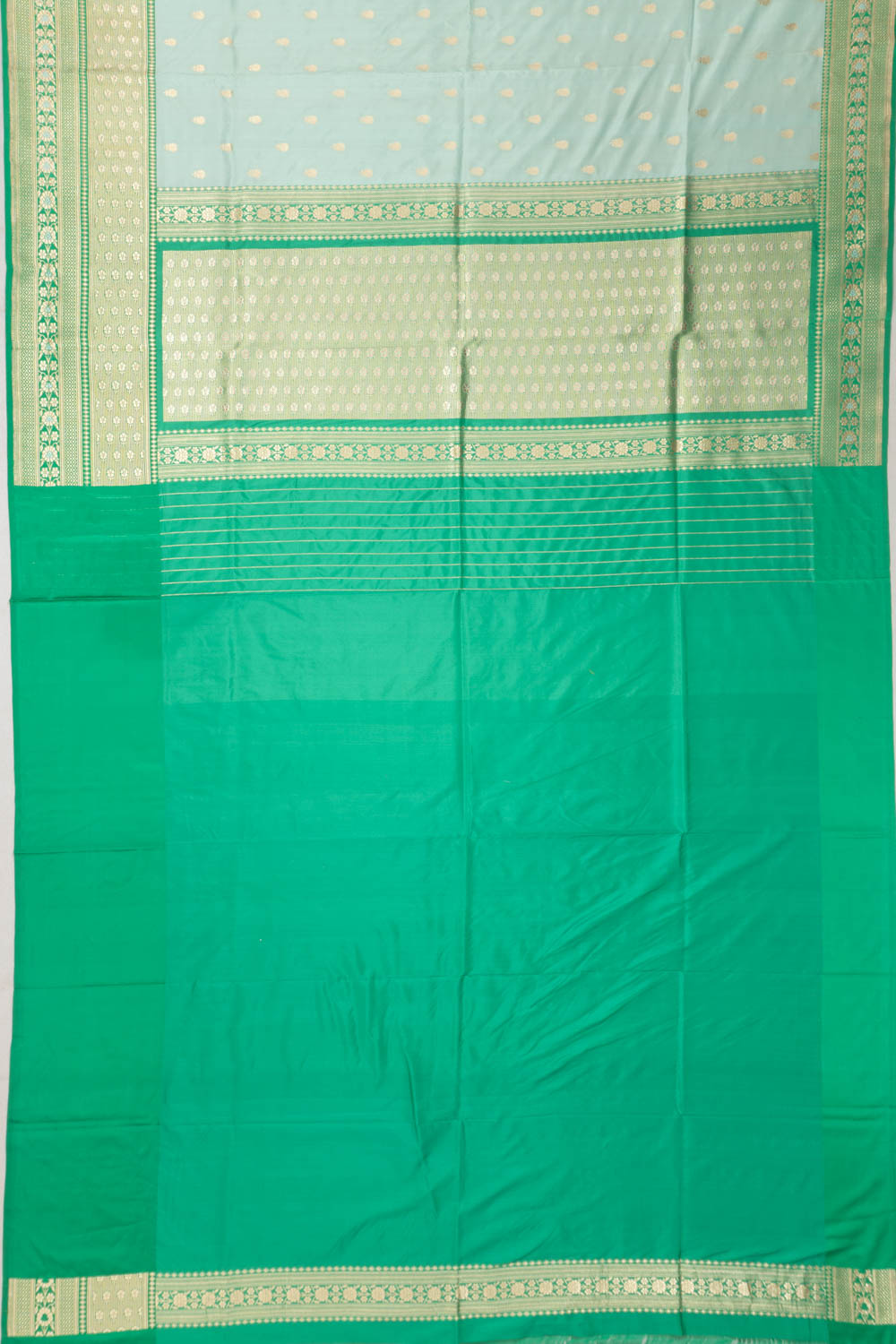 Features a contrast gold zari green border, embellished with delicate floral vine motifs for a harmonious and striking appearance.