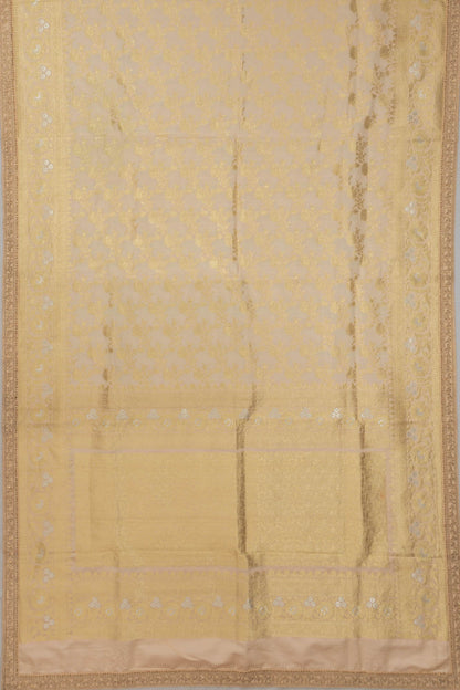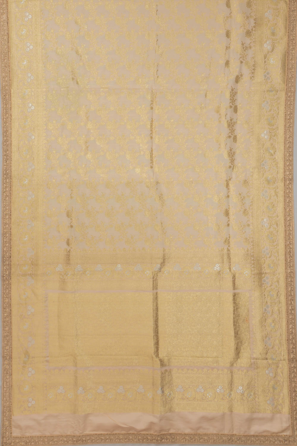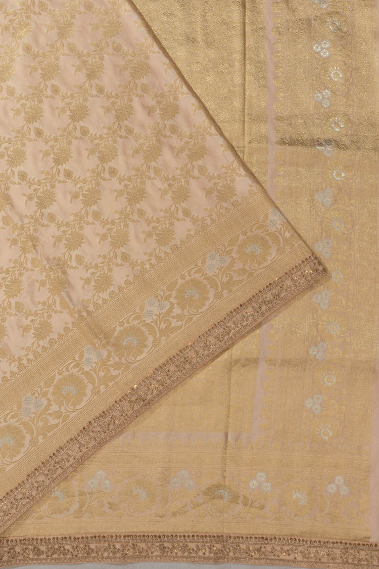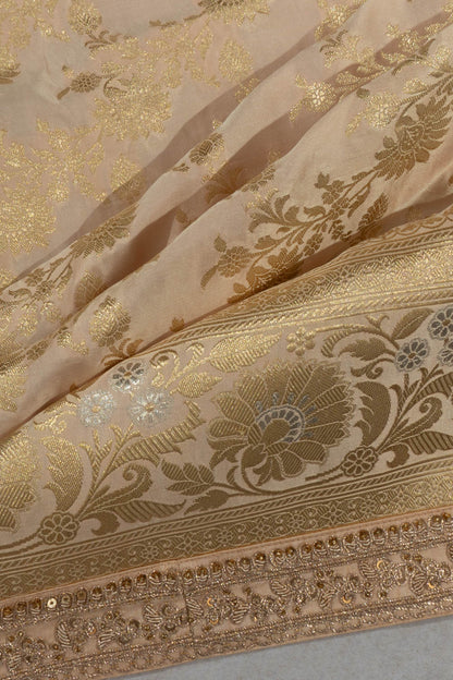 Soft peach Banarasi silk adorned with intricate gold zari floral brocade, offering a warm, radiant glow and a classic, timeless texture.