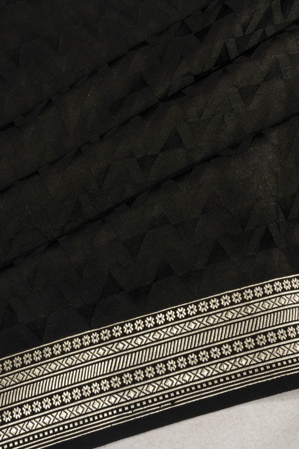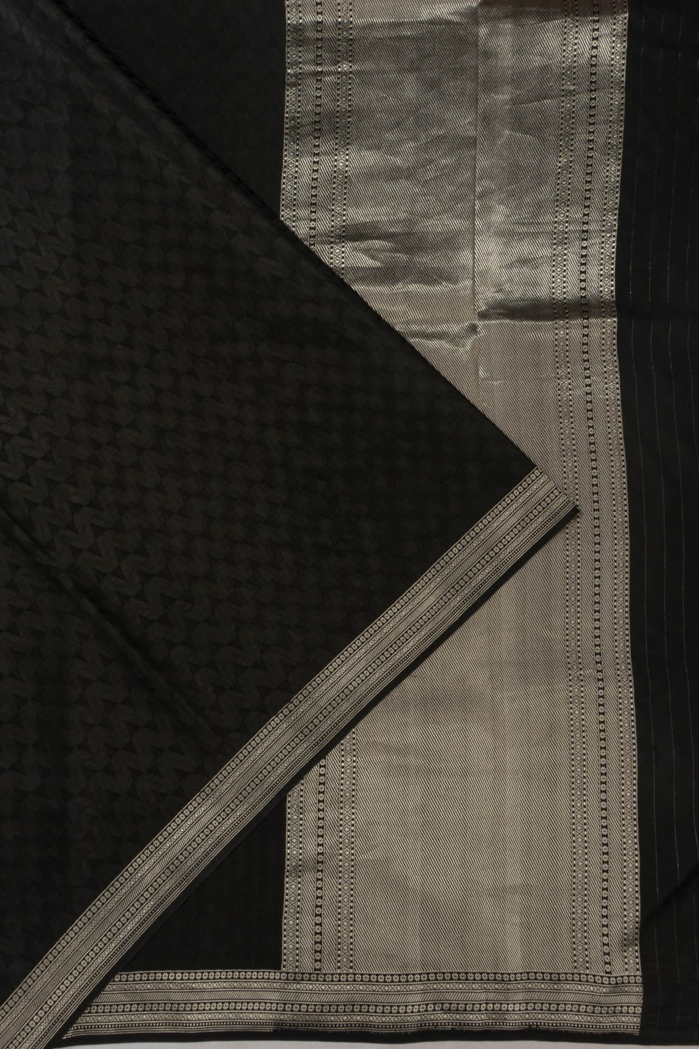 The self silver zari zig-zag lines brocade pallu enhances the design with geometric patterns, complemented by decorative tassels at the end.
