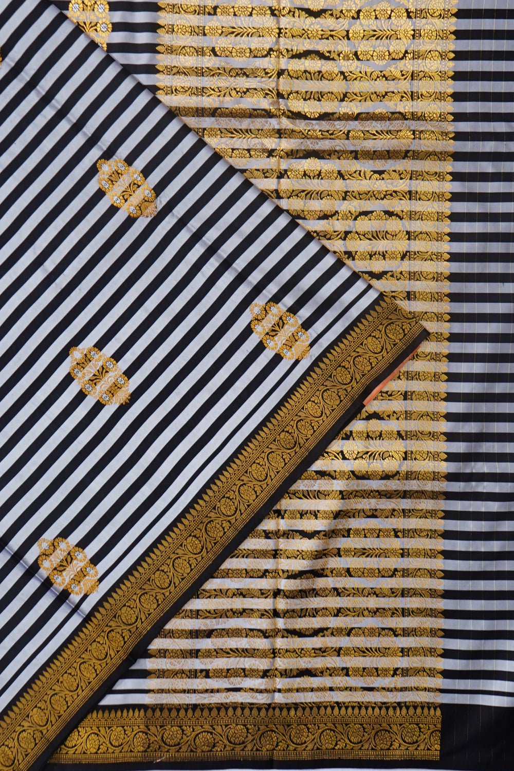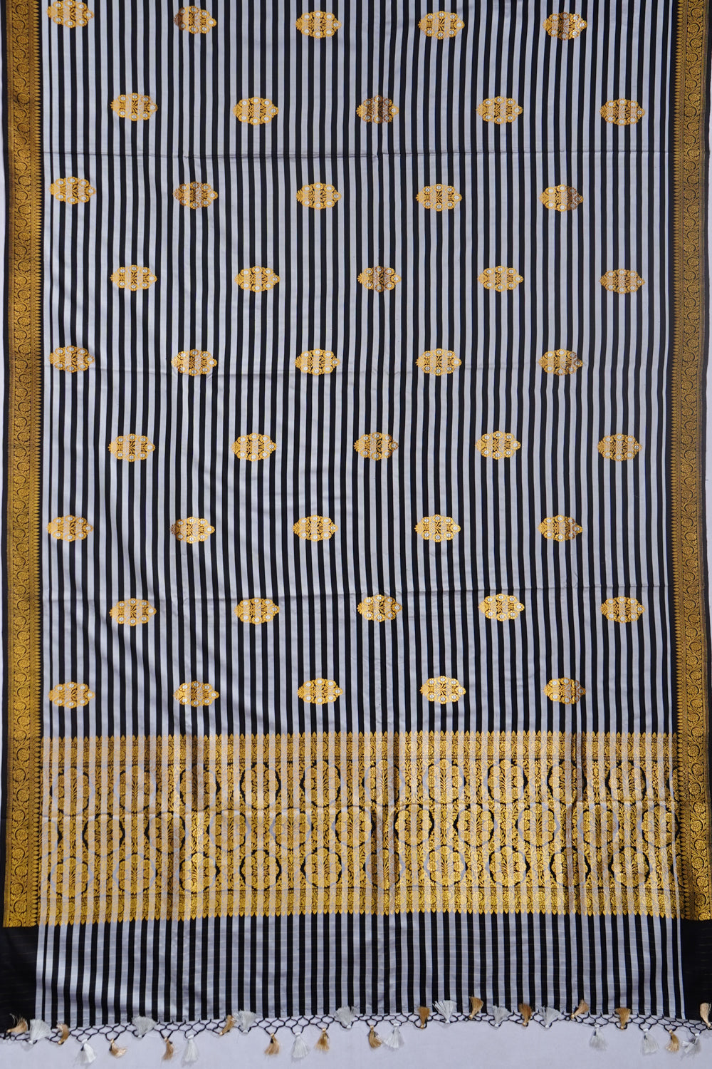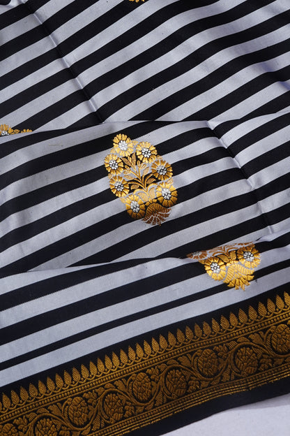 Banarasi Satin Zebra Strips And Butta Black And White Saree, Body.