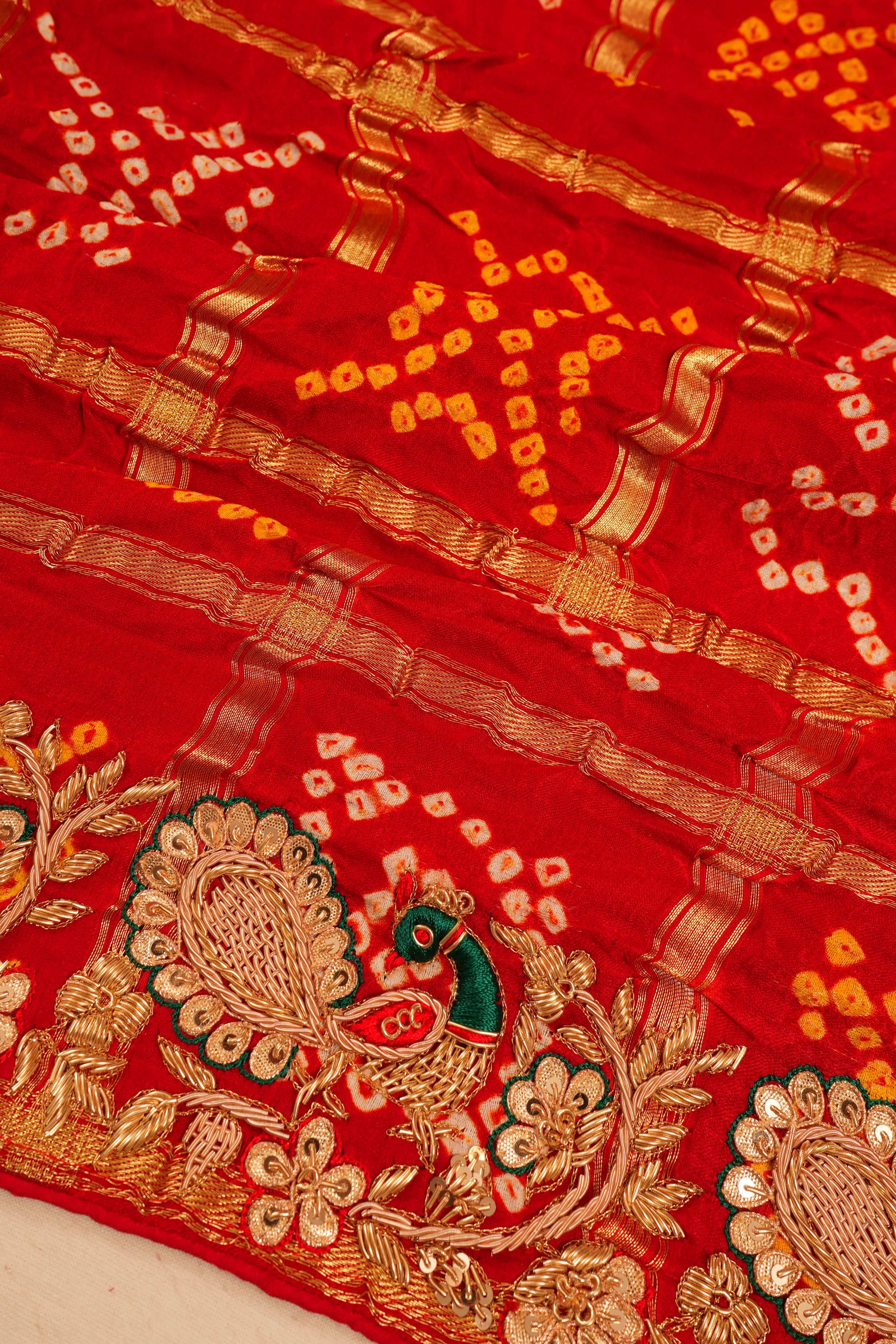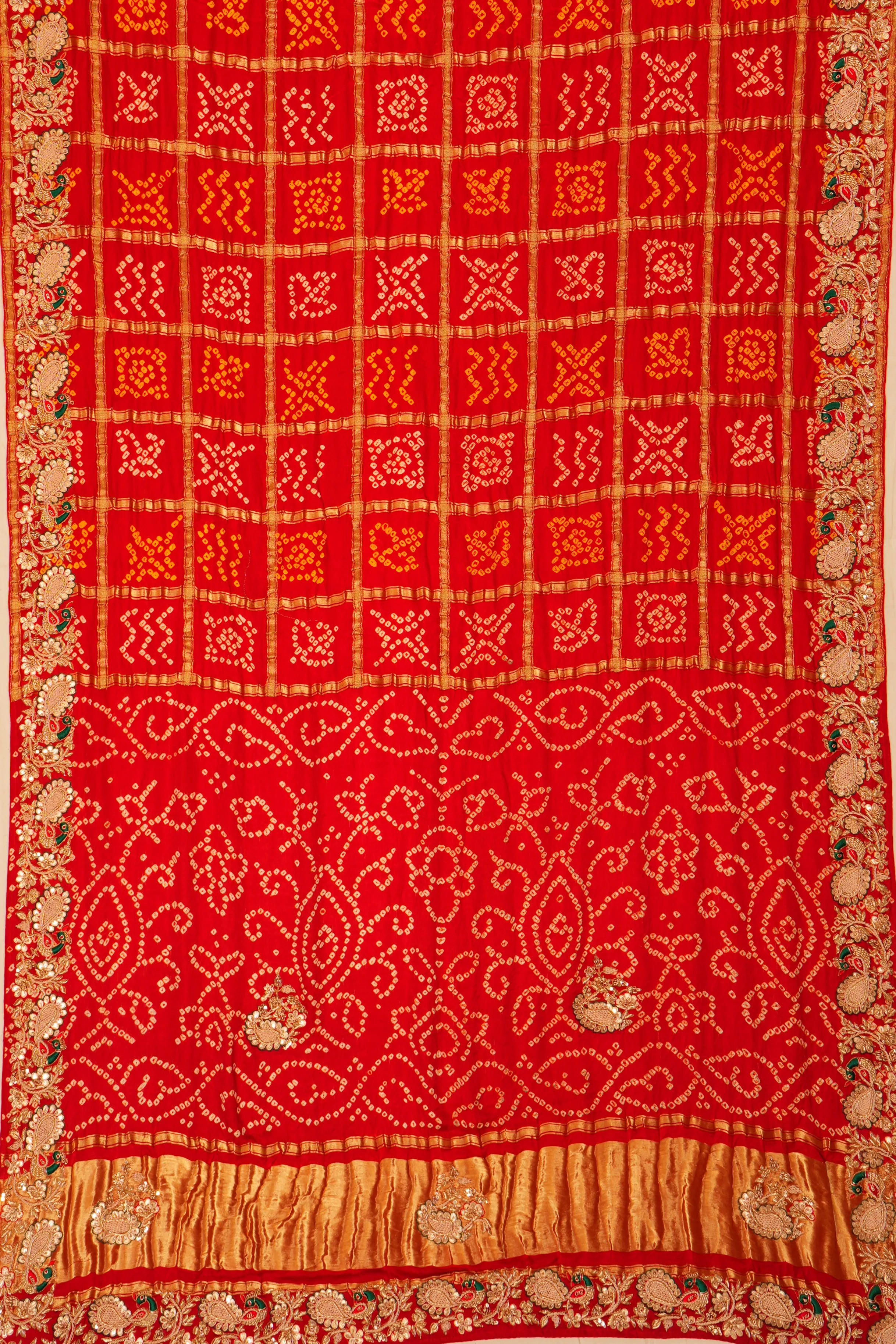 A vibrant red base featuring gold zari checks interspersed with classic bandhani dots, merging tradition with geometric precision.