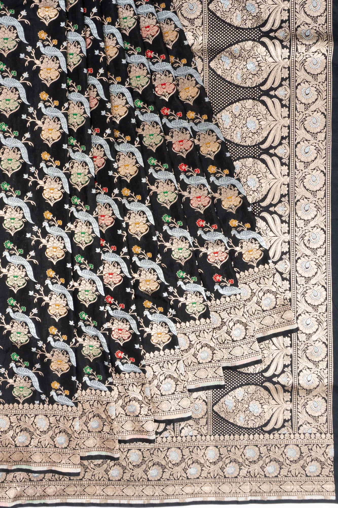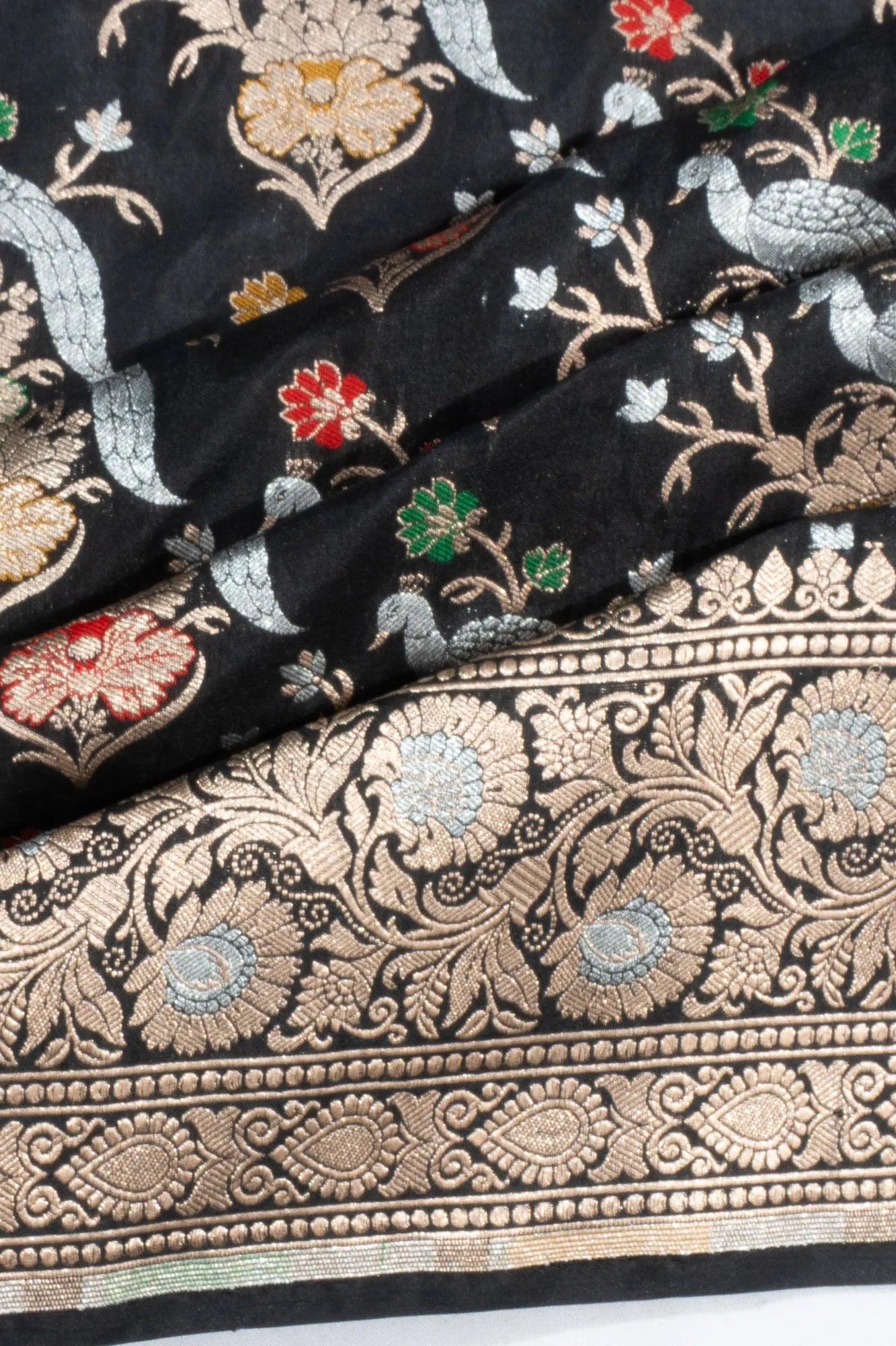 A luxurious black base intricately woven with gold zari floral brocade, highlighted by multicolour meenakari and silver zari peacock motifs, creating a vibrant and opulent visual story.
