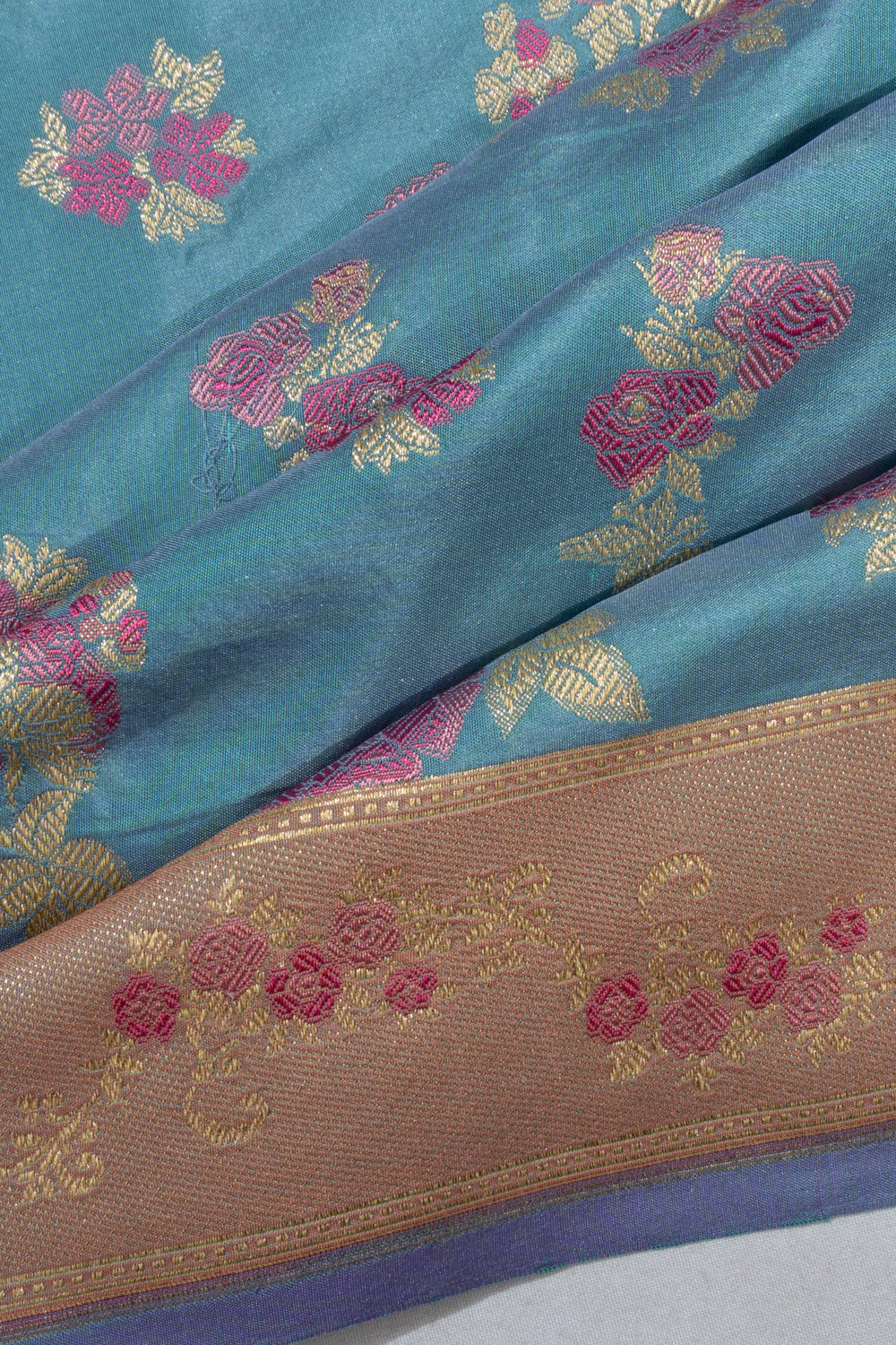 Contrast gold zari floral brocade pallu that matches the border’s richness.
