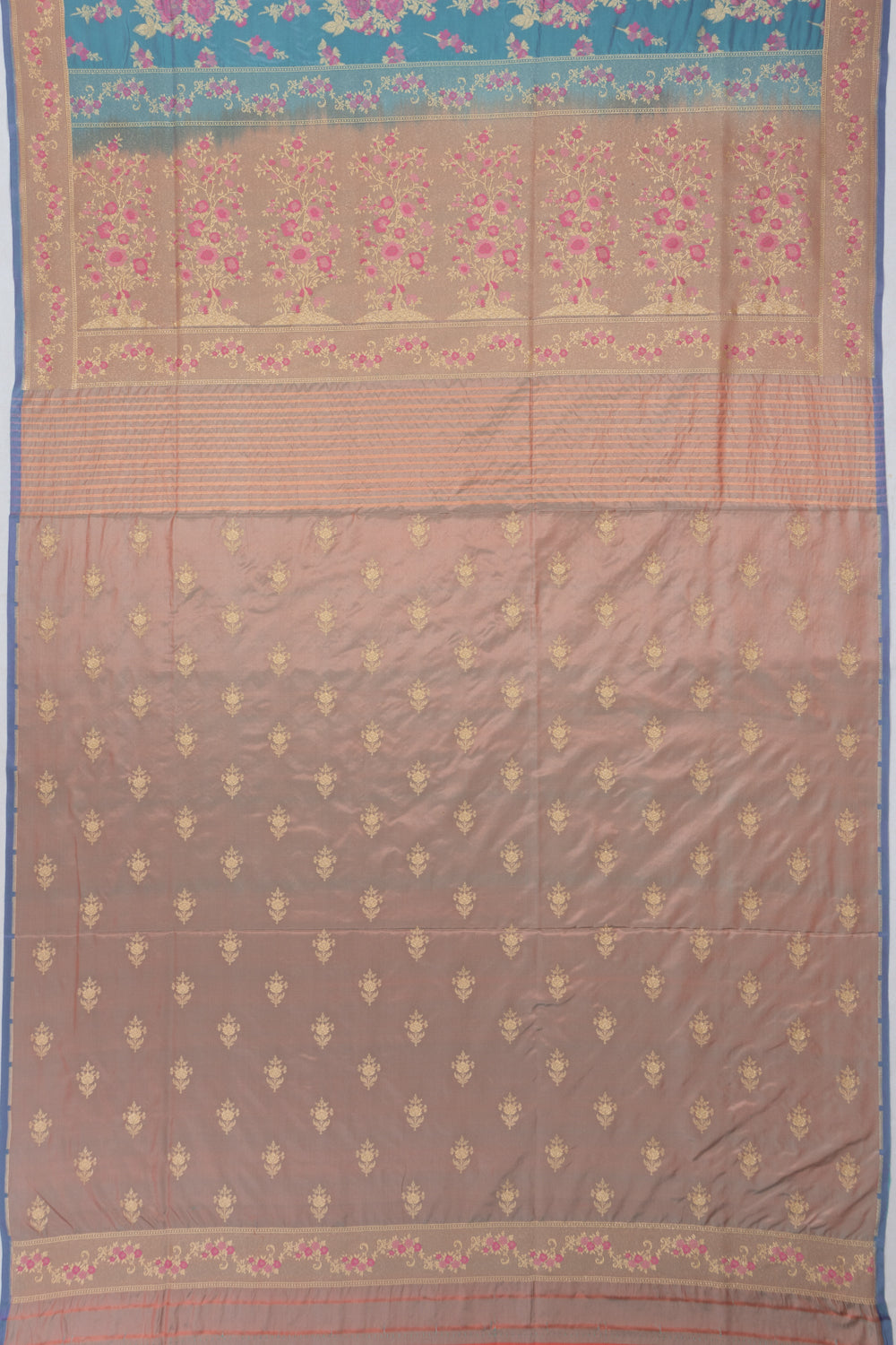 Contrast blouse decorated with gold zari floral butta, enhancing the overall design.