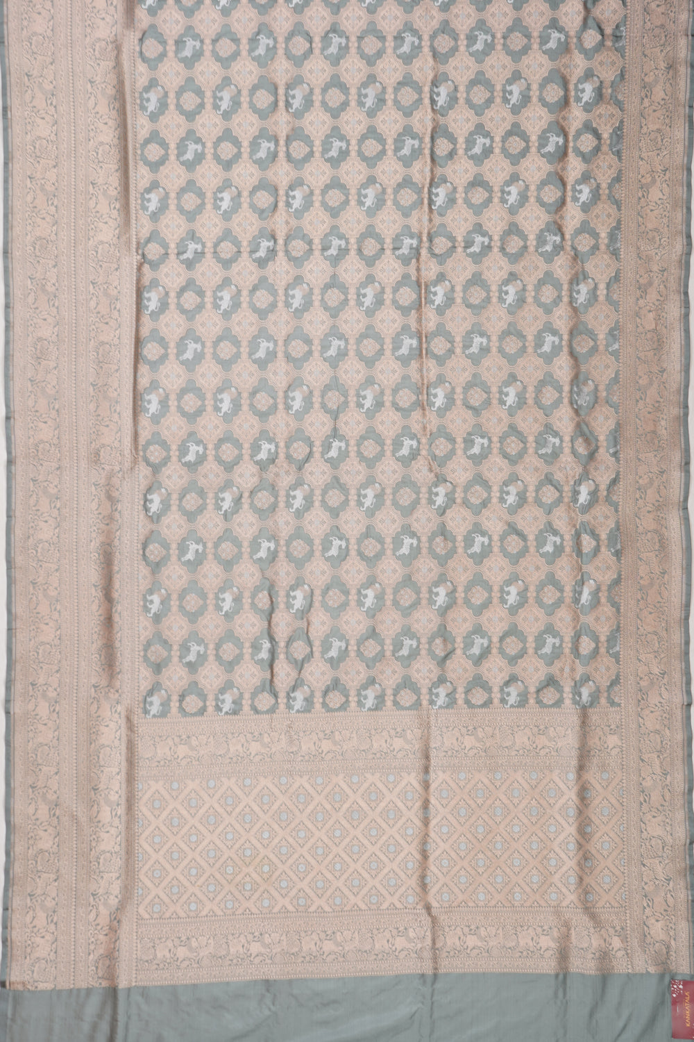 The saree's body is a luxurious expanse of rich grey silk, enhanced by the intricate artistry of brocade weaving, reflecting a sophisticated charm