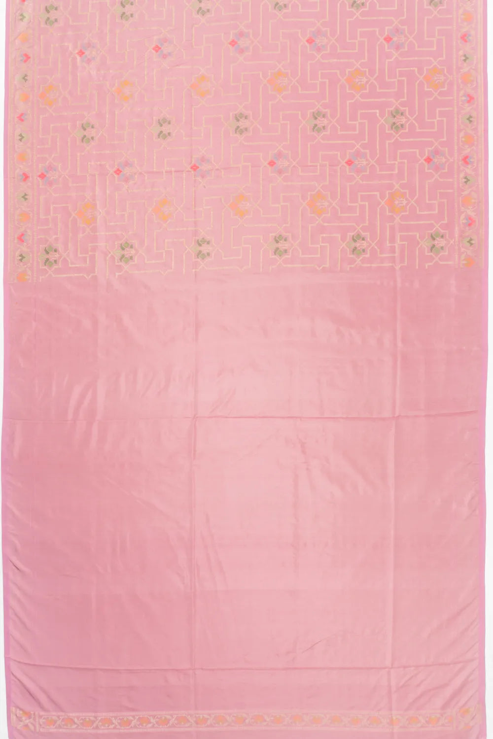 Coordinated self gold zari border woven with floral brocade, uplifted by meenakari accents in multiple hues, adding intricate depth to a classic frame.