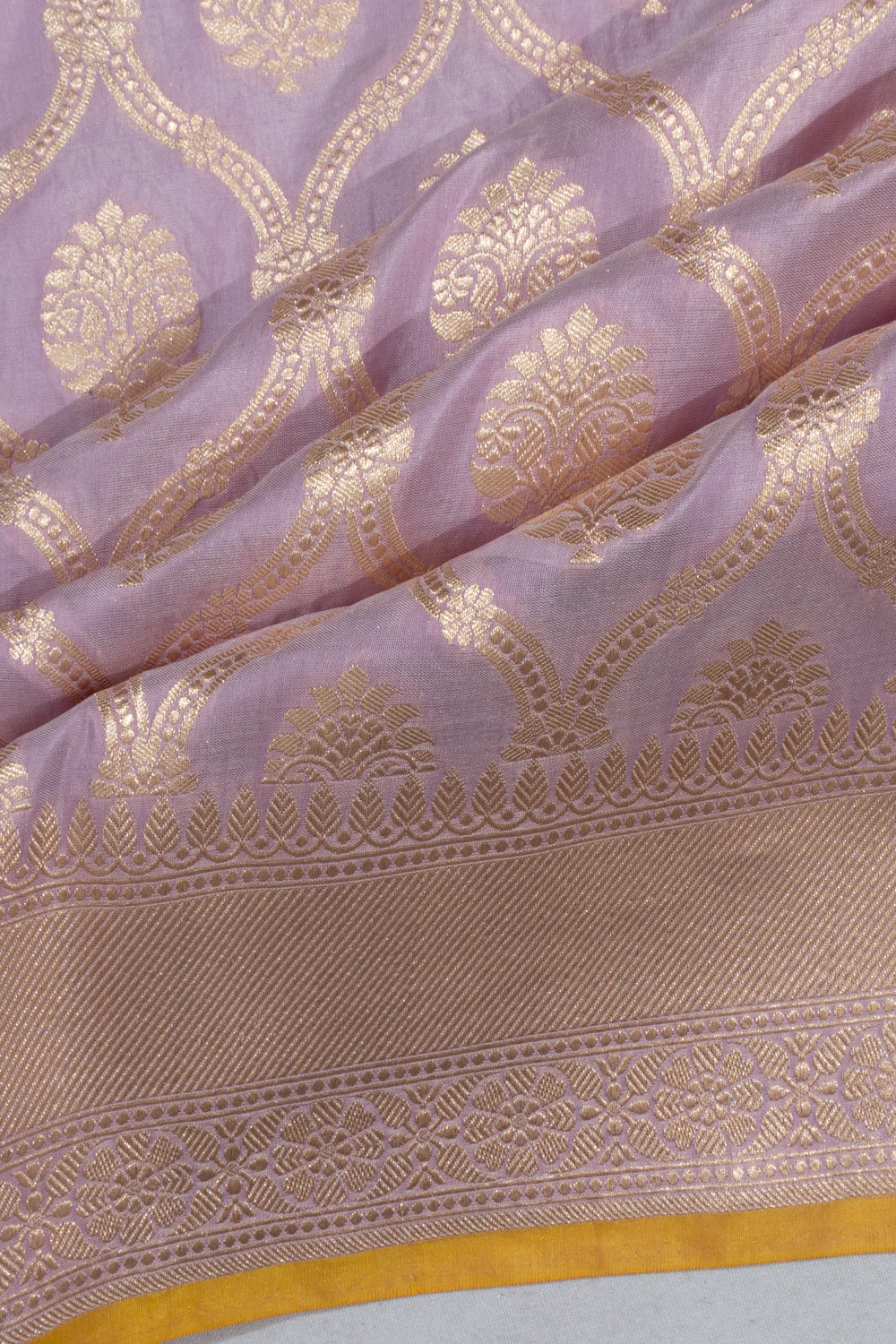 Draped in a delicate lavender shade, the saree’s body is woven with gold zari floral brocade, combining softness with regal texture.