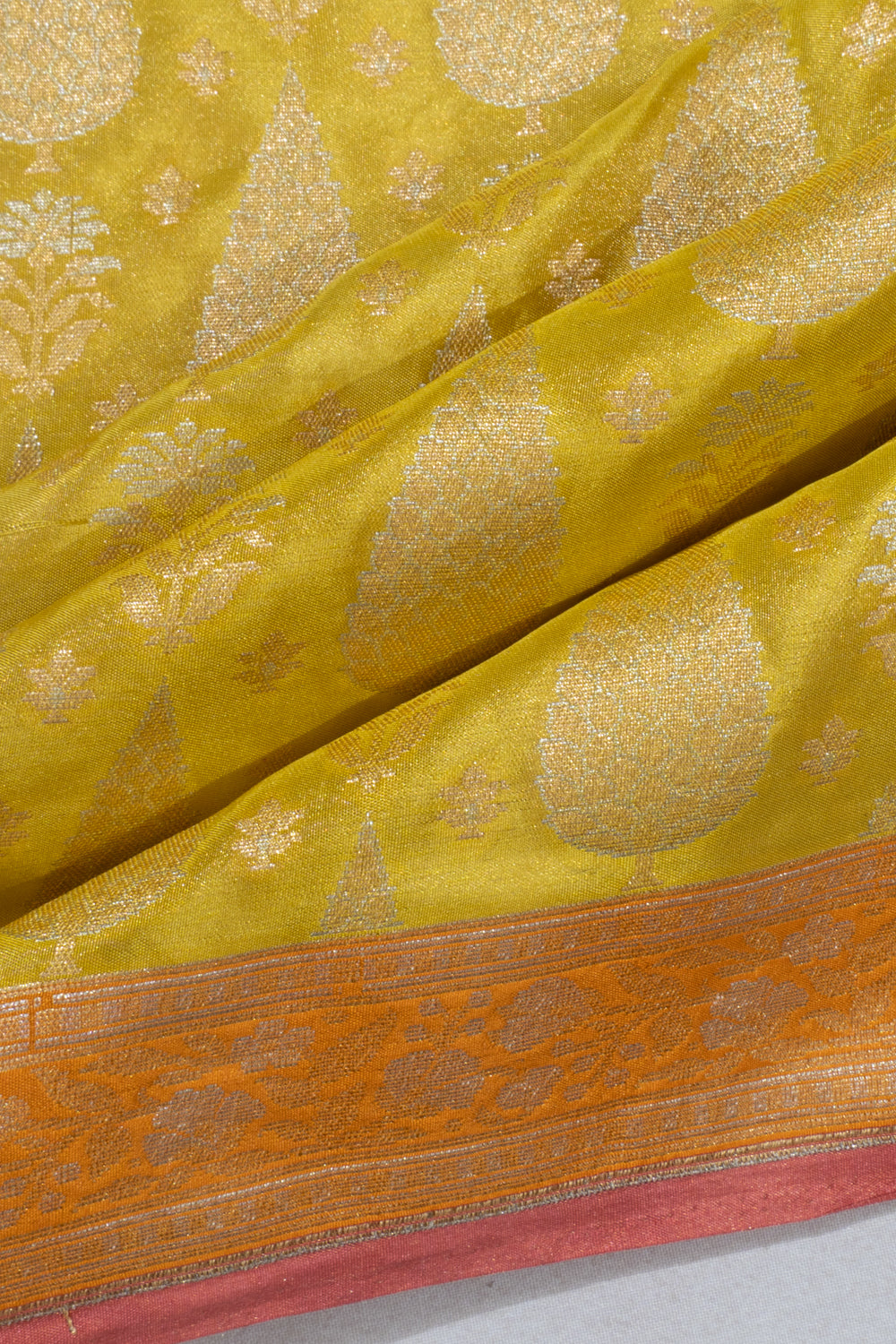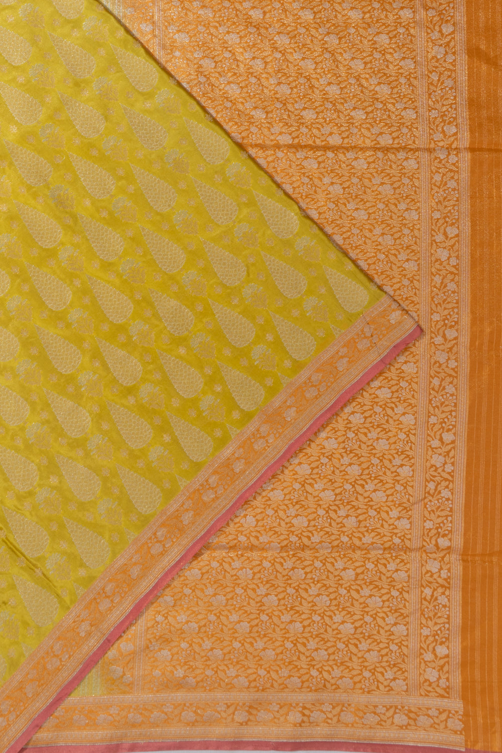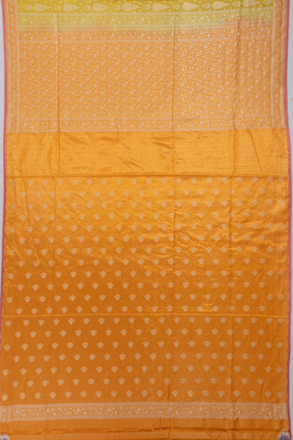 A small contrast orange border crafted with gold and silver zari floral vines, finished with a delicate pink edge, adding a dual-tone touch of sophistication.