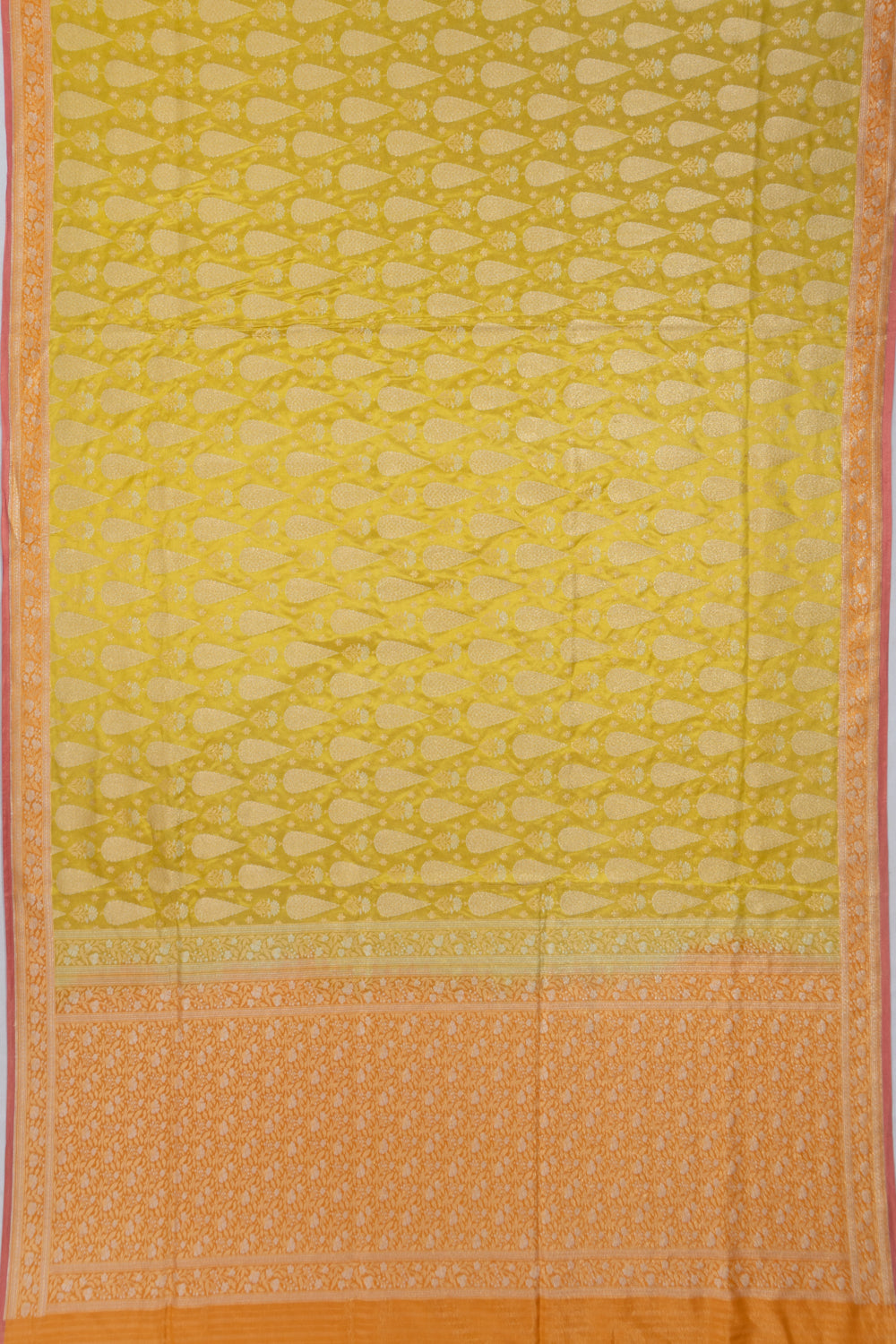 Comes with a contrast orange blouse detailed with gold zari floral buttas, enhancing the traditional grandeur of the saree.