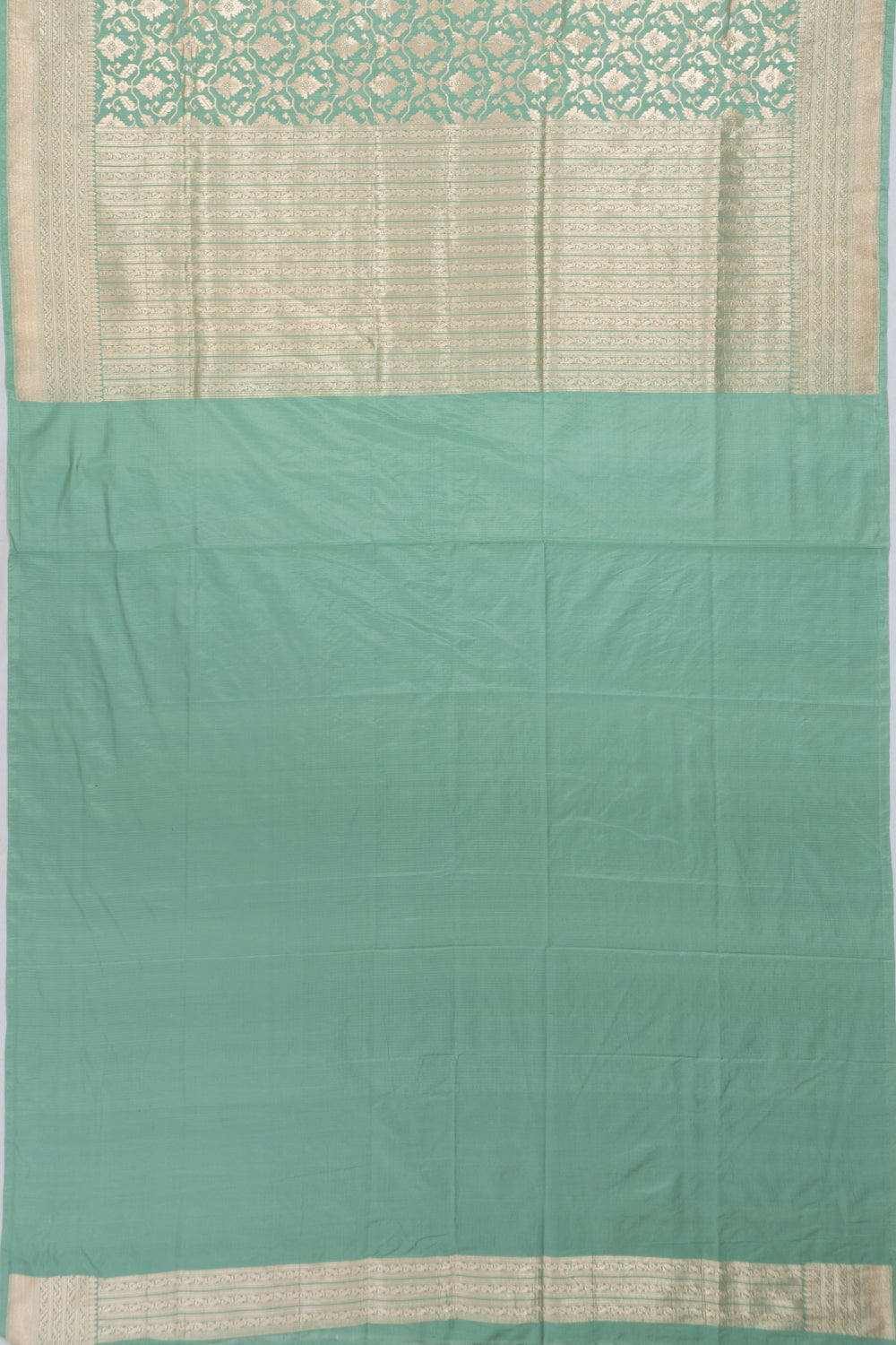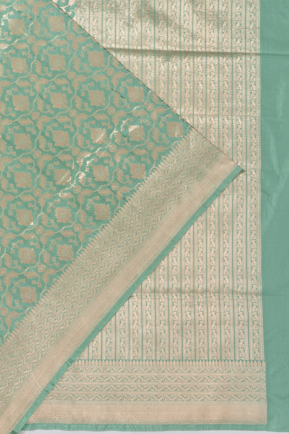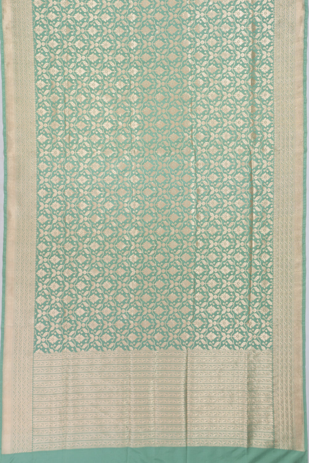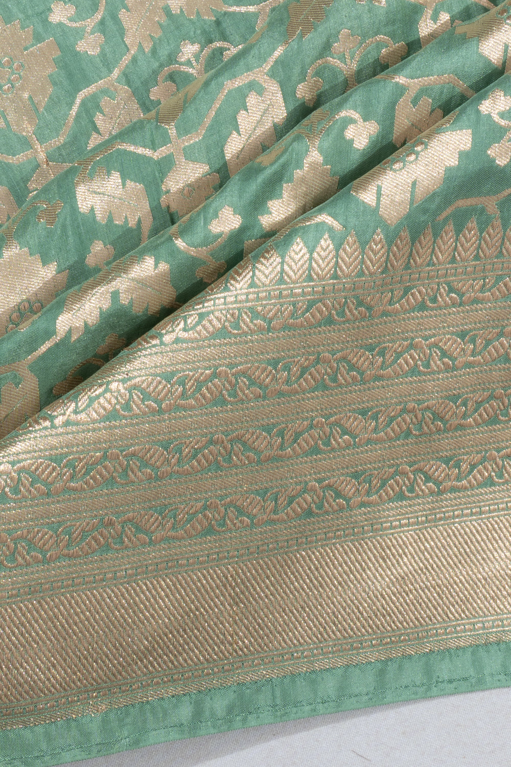 Gold zari floral brocade intricately woven on a soft pastel green Silk base, offering a delicate and fresh look.
