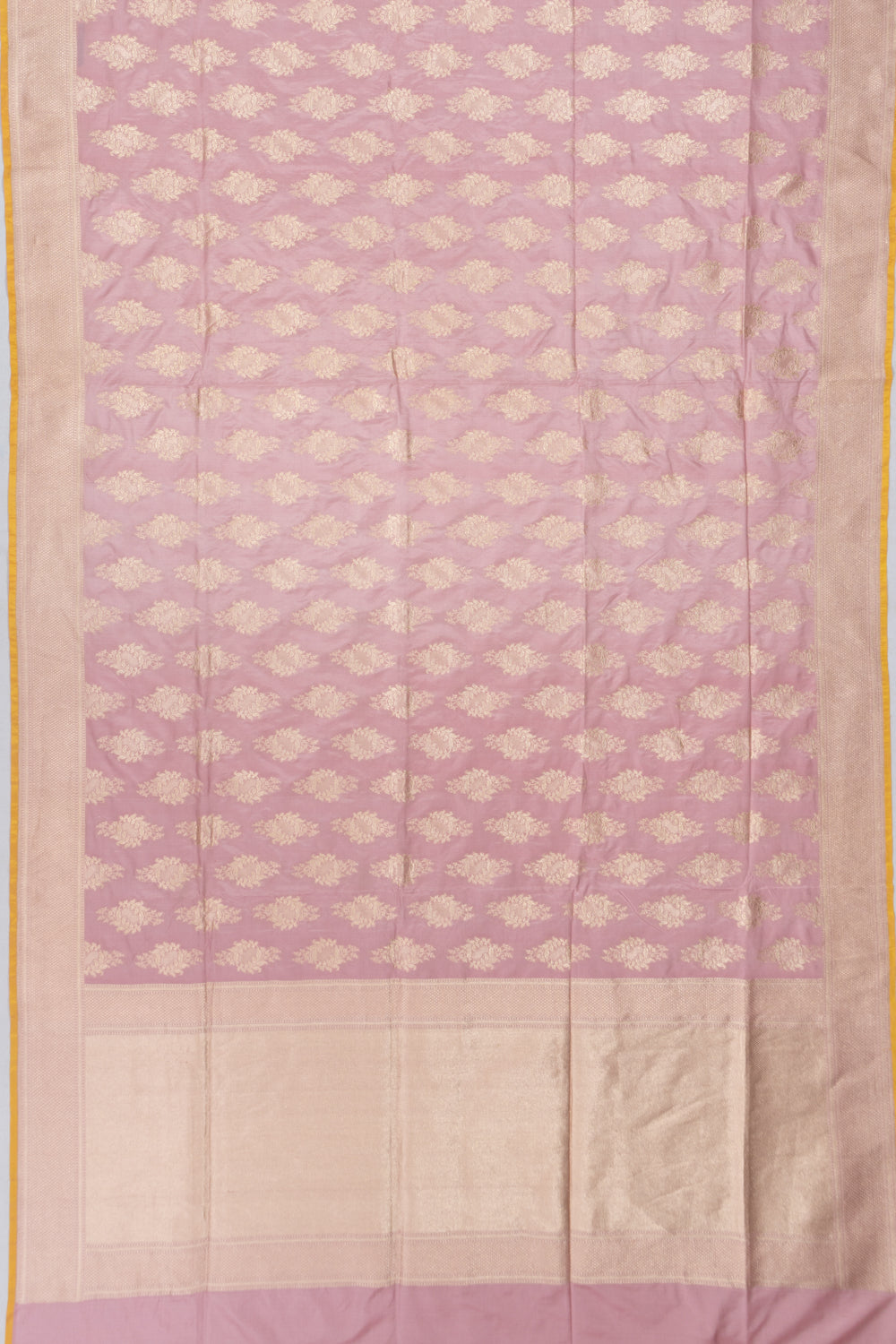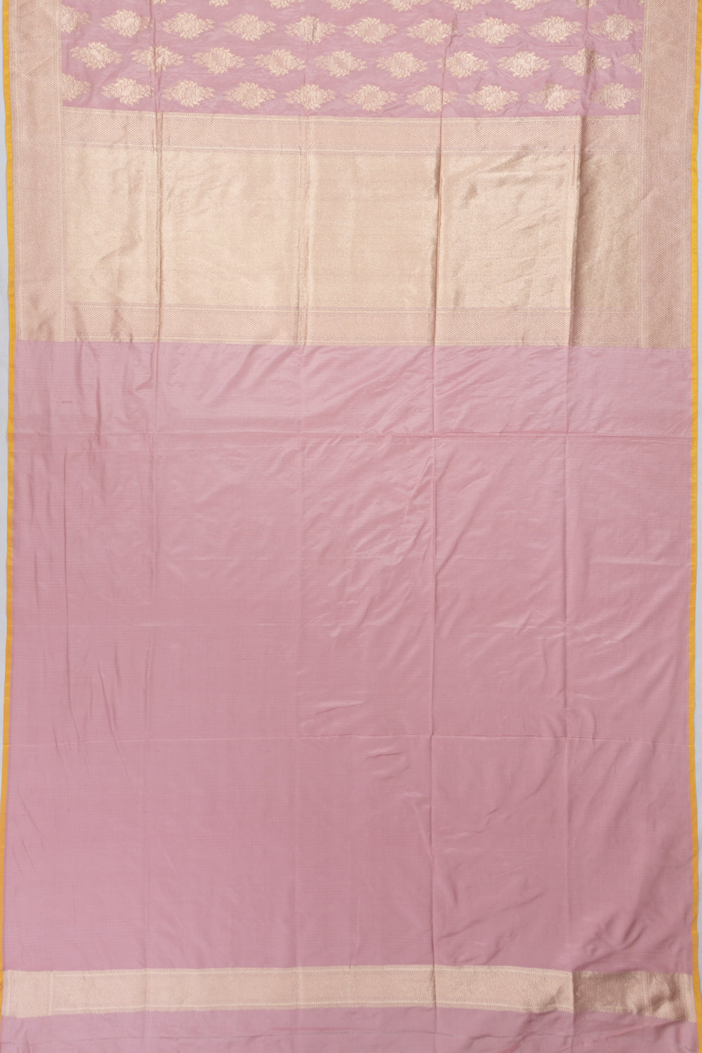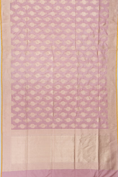 Embellished with fine floral brocade in gold zari on a gentle pastel pink Silk fabric, exuding timeless charm.