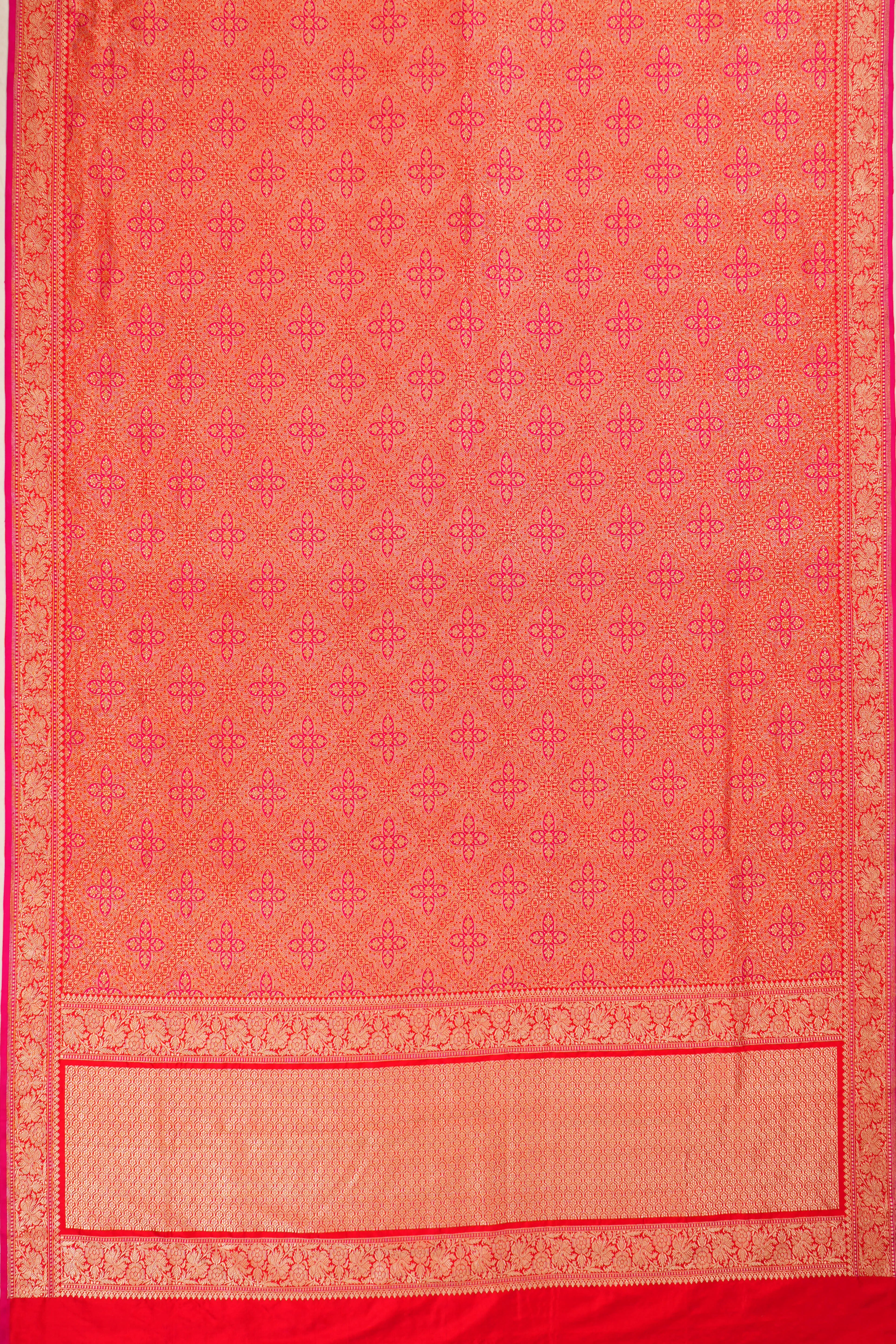 A stunning blend of pink and orange, this saree features intricate gold zari floral brocade work, offering a vibrant yet traditional aesthetic.