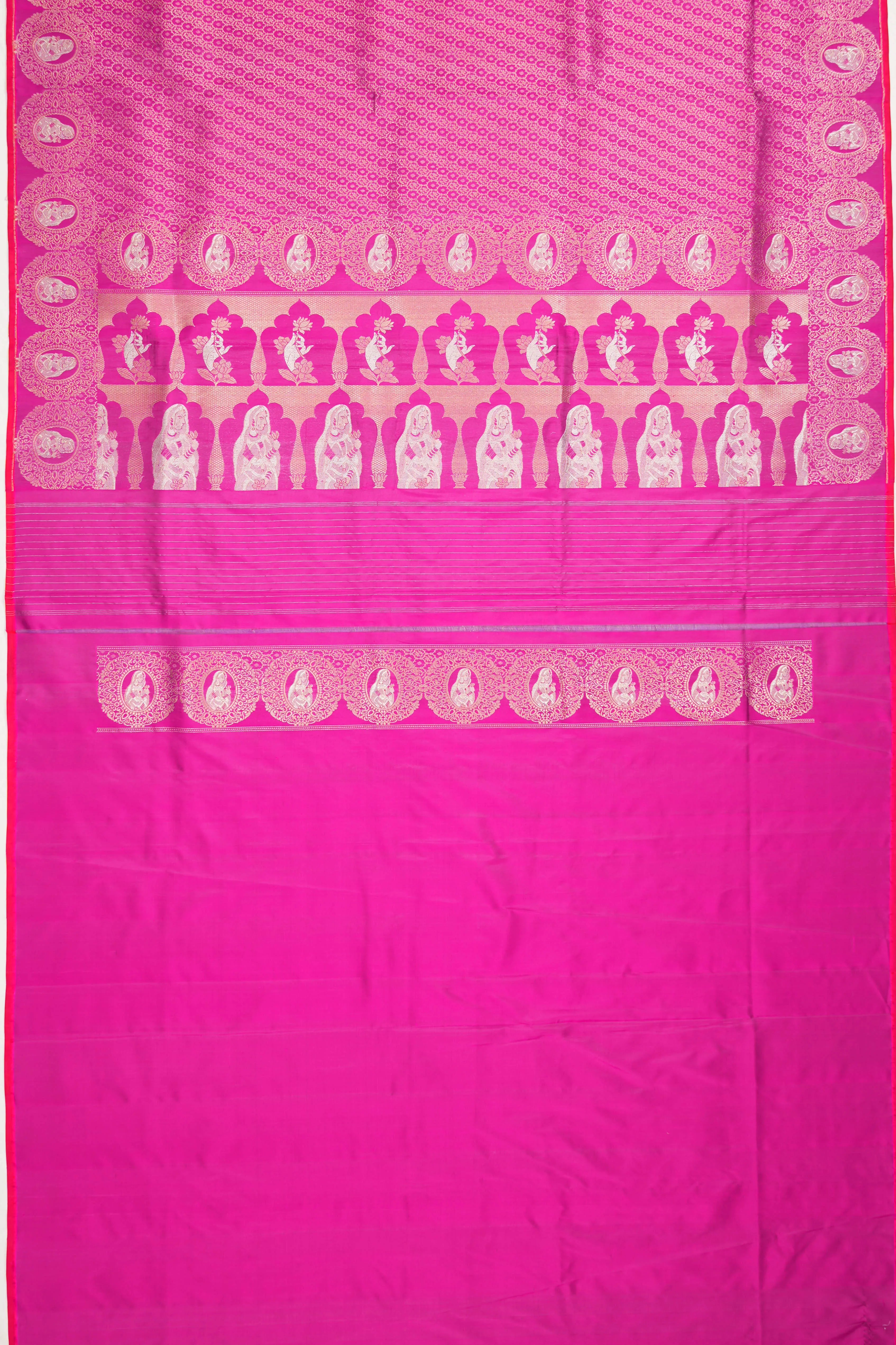 Elegant pink Banarasi silk enhanced with intricate gold zari floral brocade, offering timeless charm.