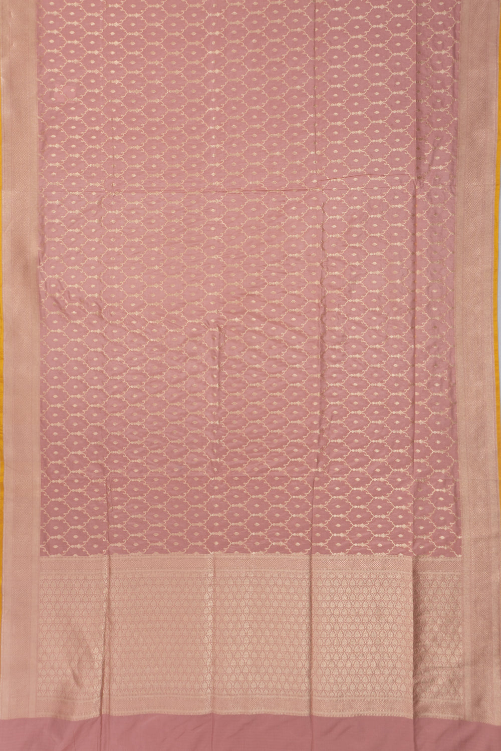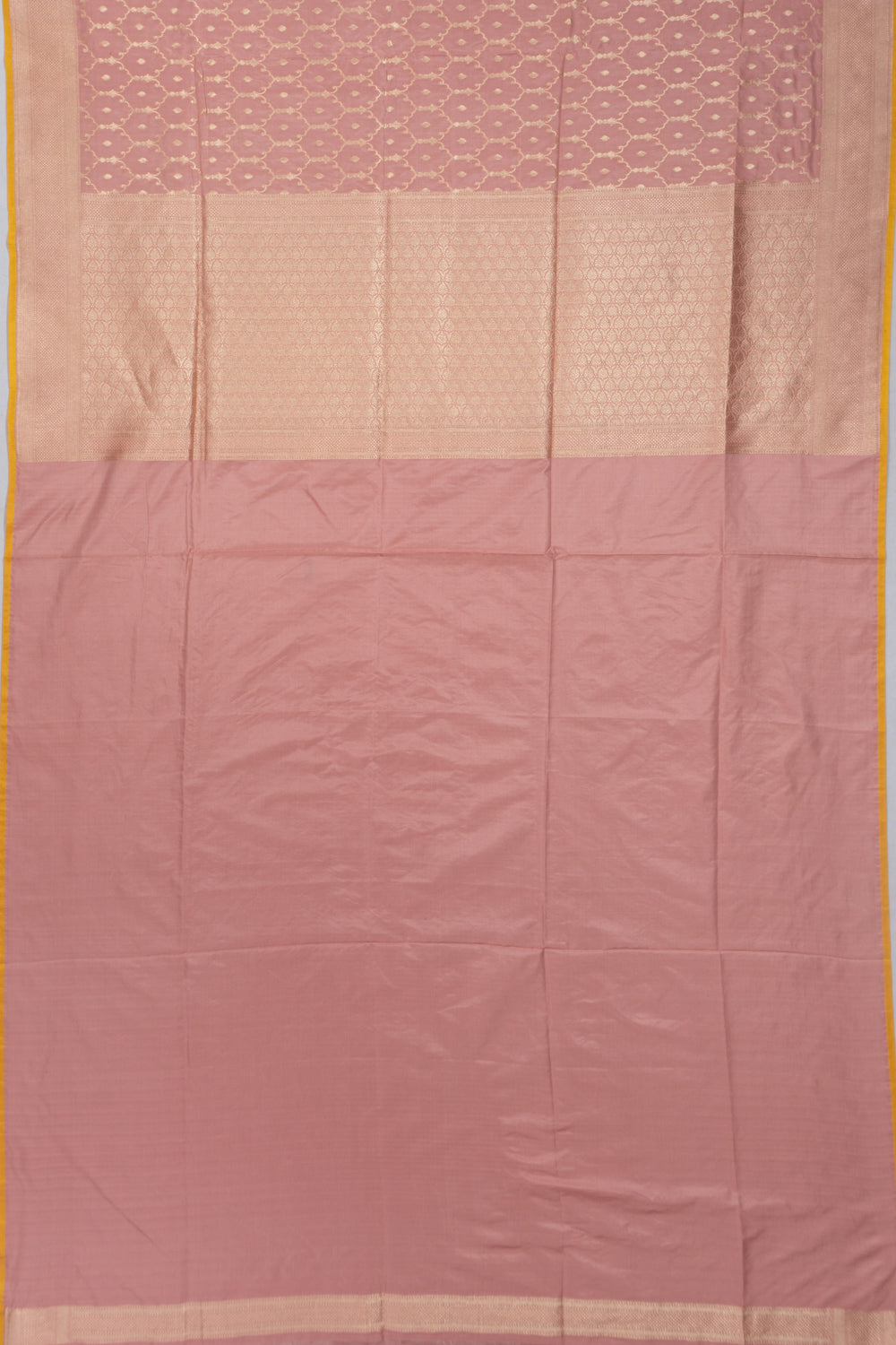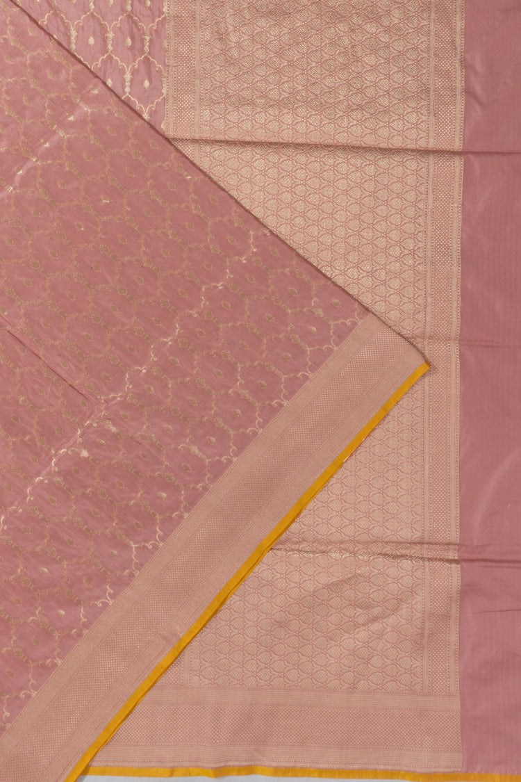 Graceful pink Silk enriched with gold zari floral brocade, lending an elegant and festive look.