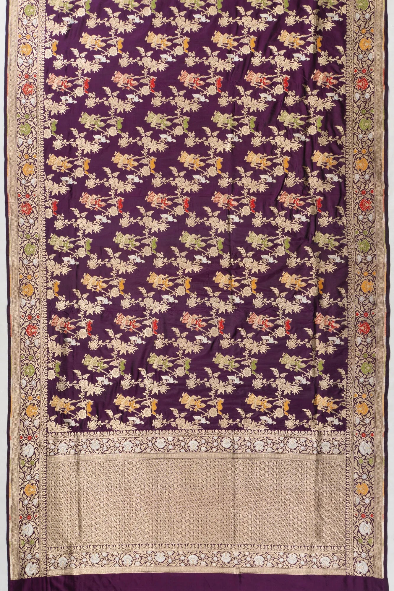 The saree is bordered by a self gold zari brocade, showcasing medium floral vines and multicolor meenakari, which seamlessly enhances its heritage appeal