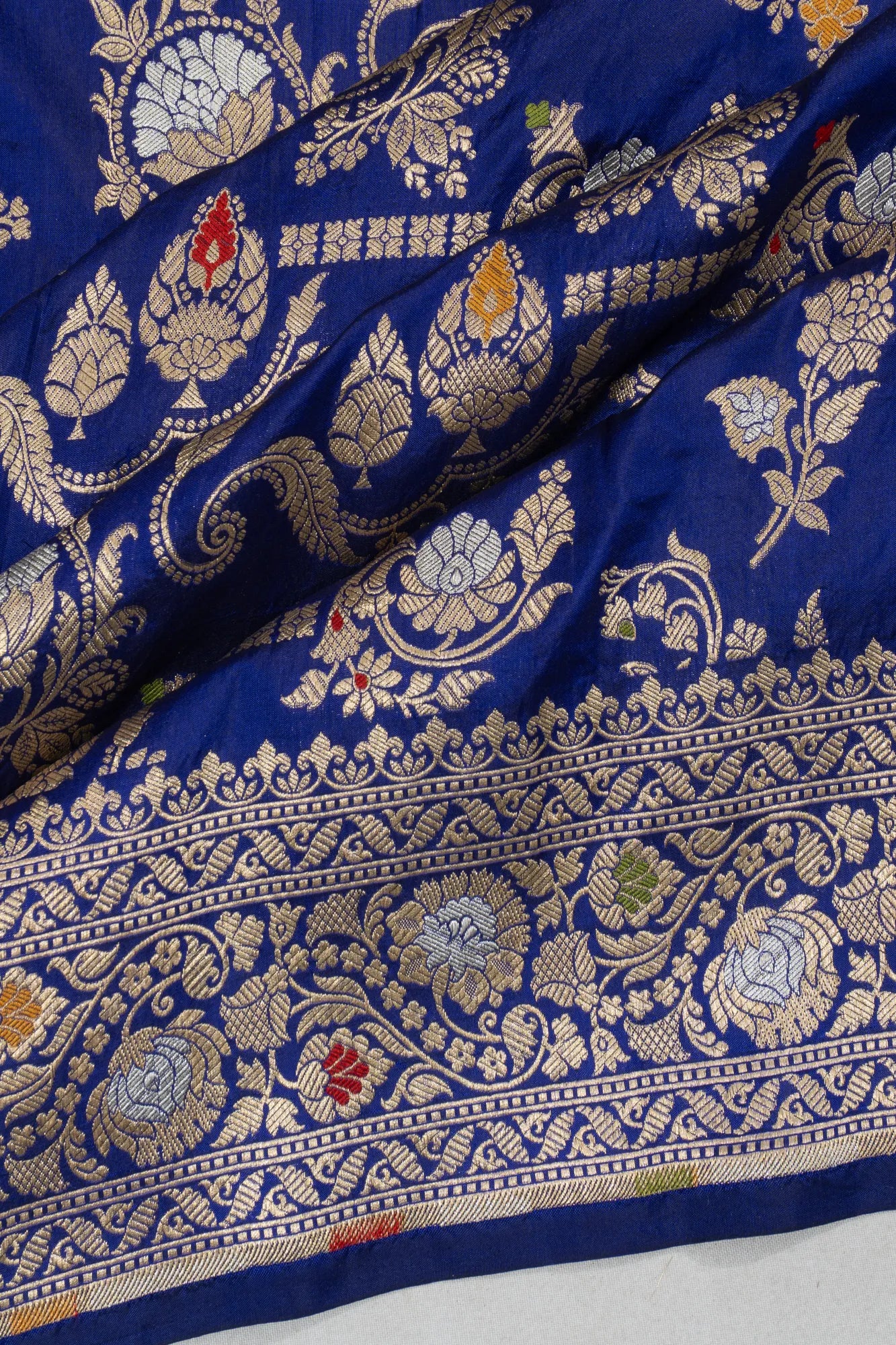 The saree's body is adorned with gold and silver zari floral brocade, accentuated by multicolour meenakari, creating a vibrant tapestry of intricate artistry