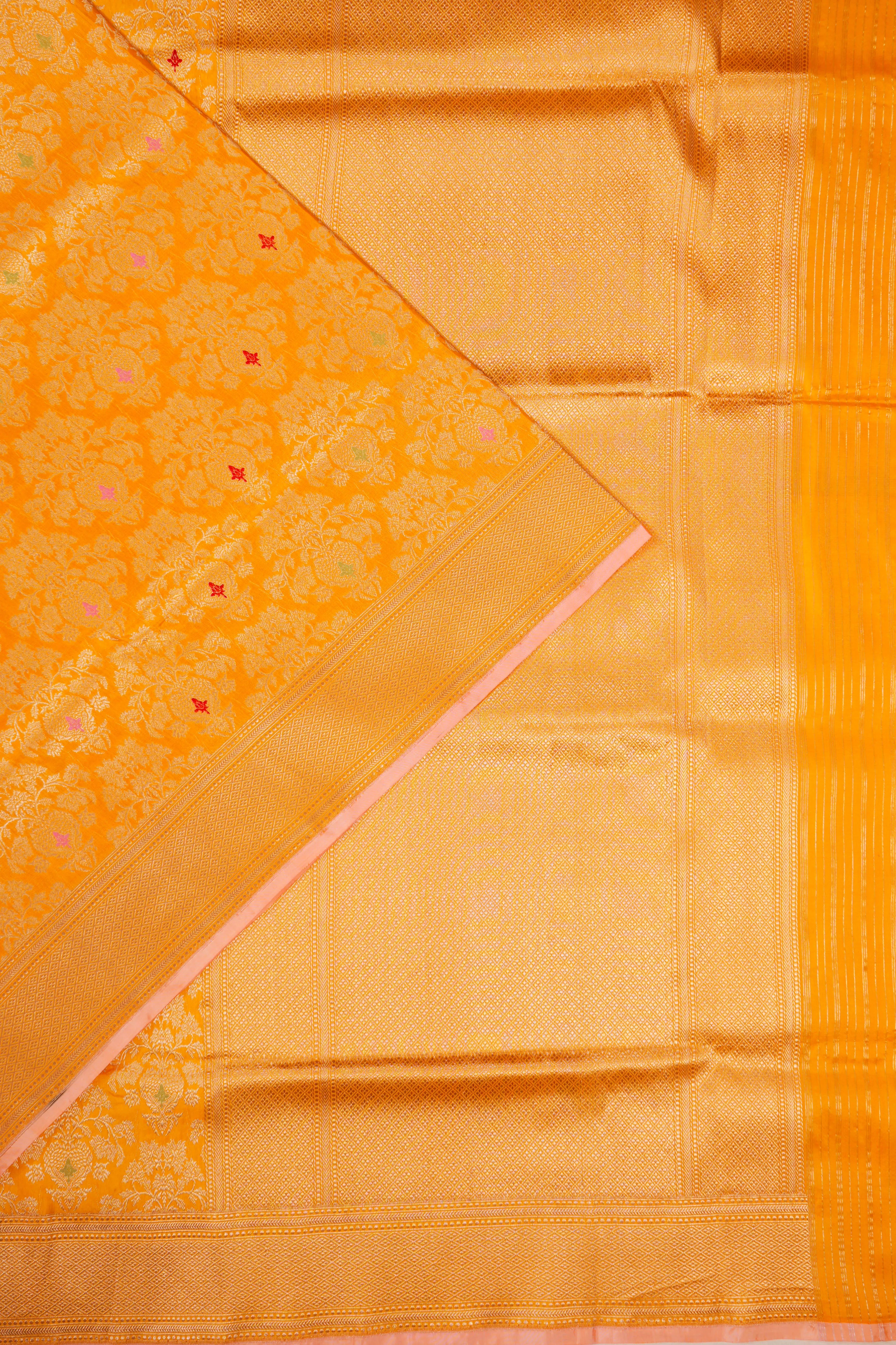 This bright and cheerful yellow Banarasi silk saree is adorned with an intricate gold zari floral brocade design, enhanced by multicolour meenakari that adds depth and richness to the fabric.