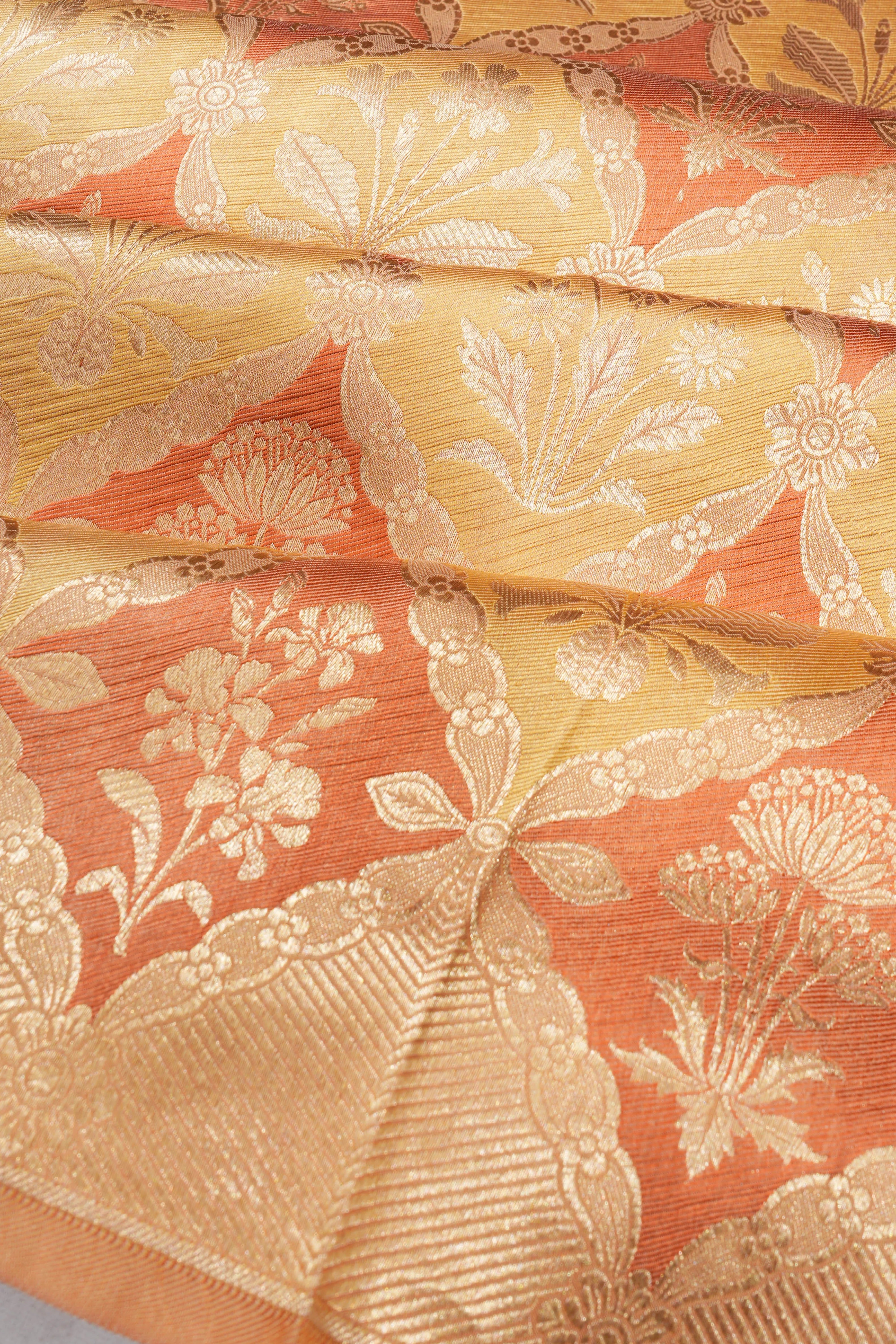 All-over gold zari floral brocade on a vibrant mustard yellow base, blending brightness with timeless craftsmanship.