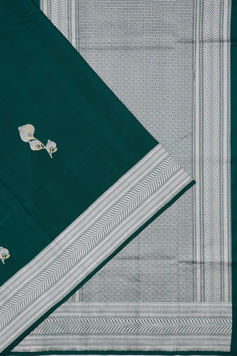 The vibrant bottle green silk is adorned with gold and silver zari floral buttas, adding a touch of timeless elegance and sophistication