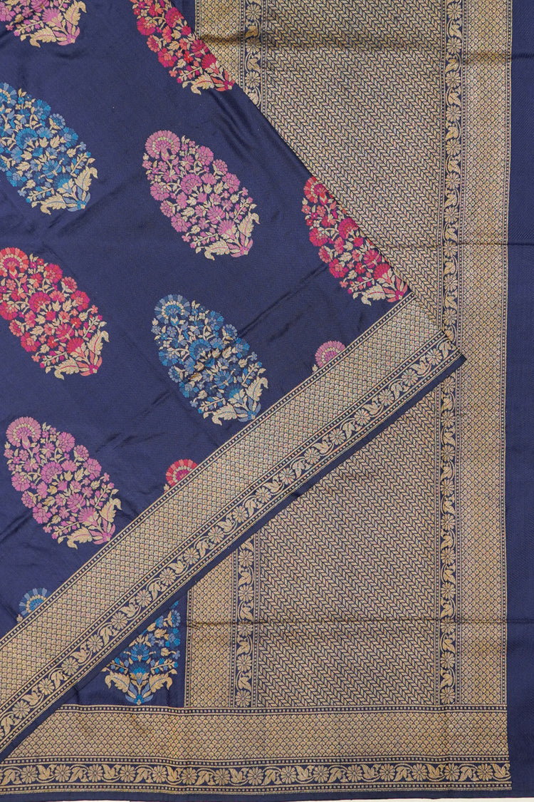 Body: The saree features gold zari butta with multi-color florals on a dark blue silk base, offering a rich and vibrant design.