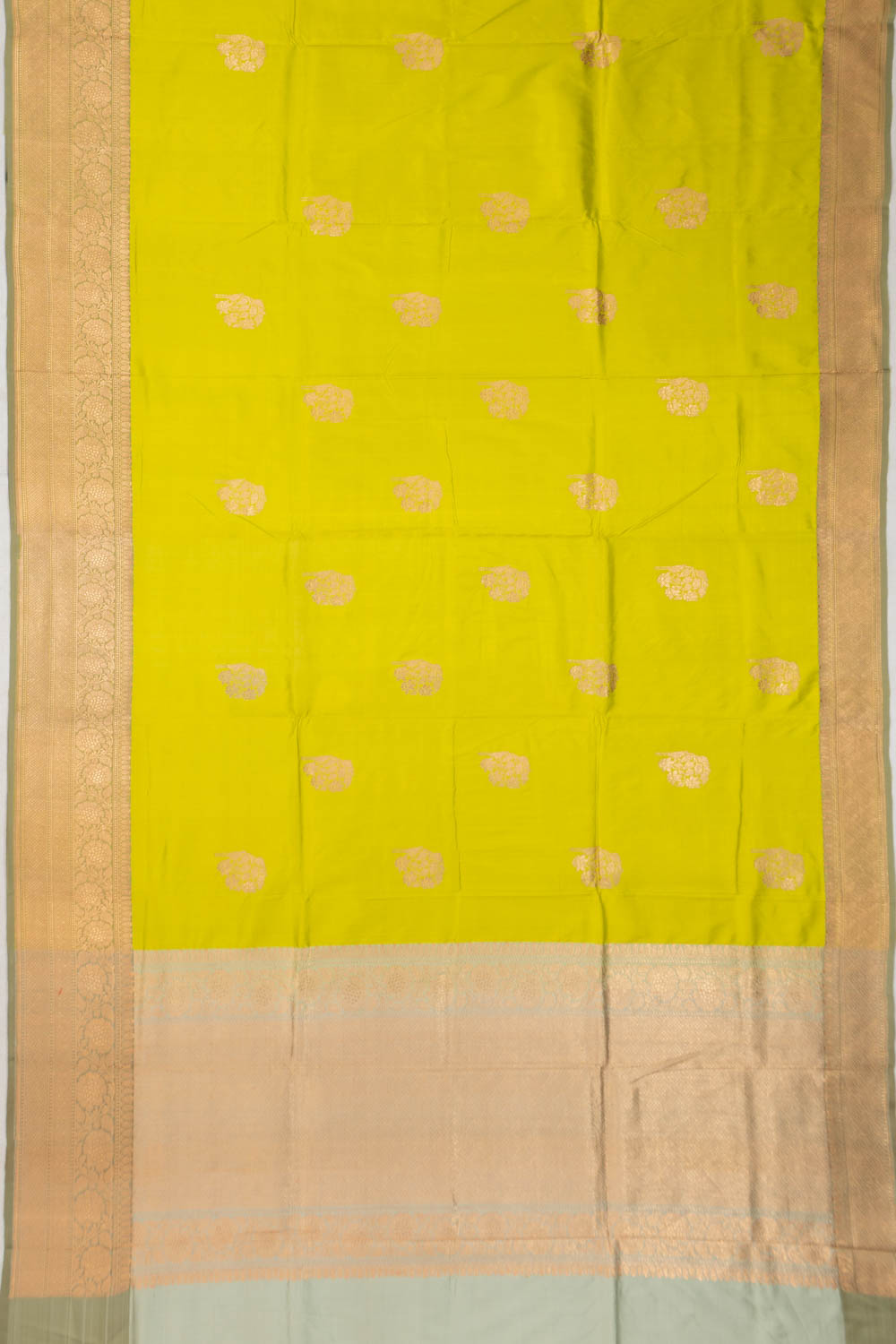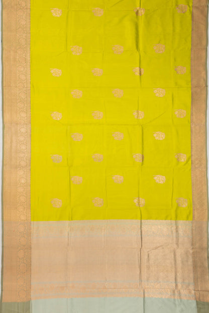 Rich mehendi green Banarasi silk adorned with gold zari floral butta, offering an earthy, luxurious appeal with a subtle yet striking shimmer.