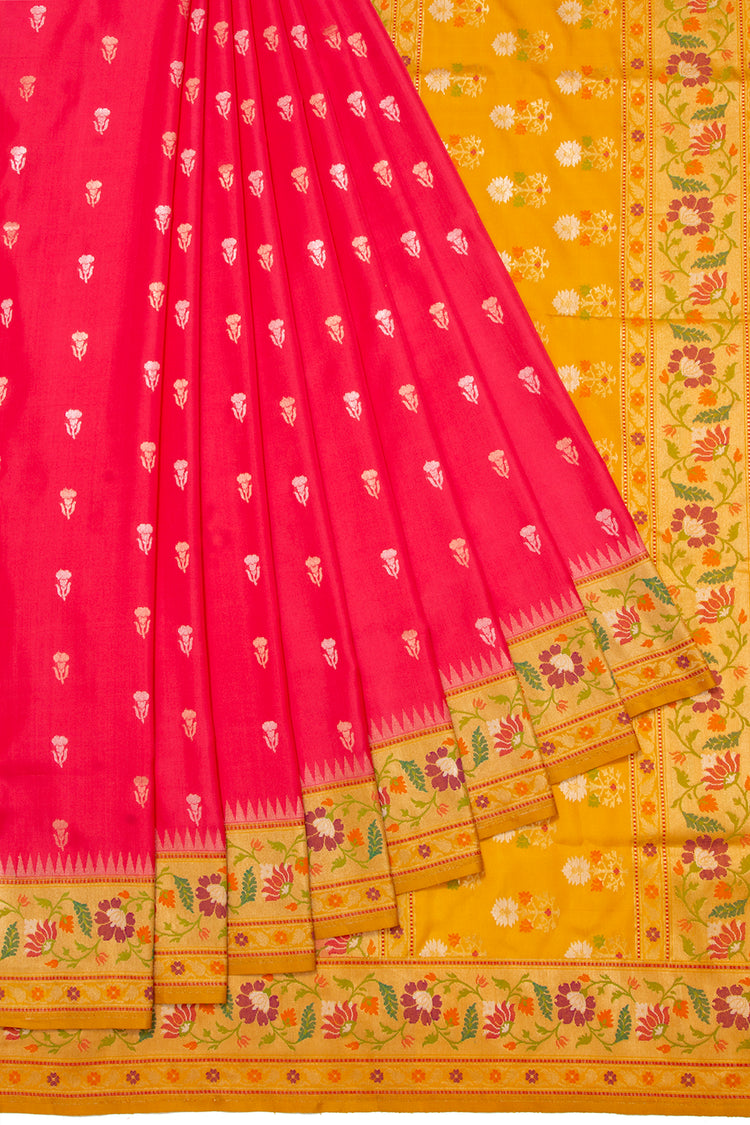 Floral butta, a delicate and intricate weave that enhances the saree’s elegance with a touch of tradition.