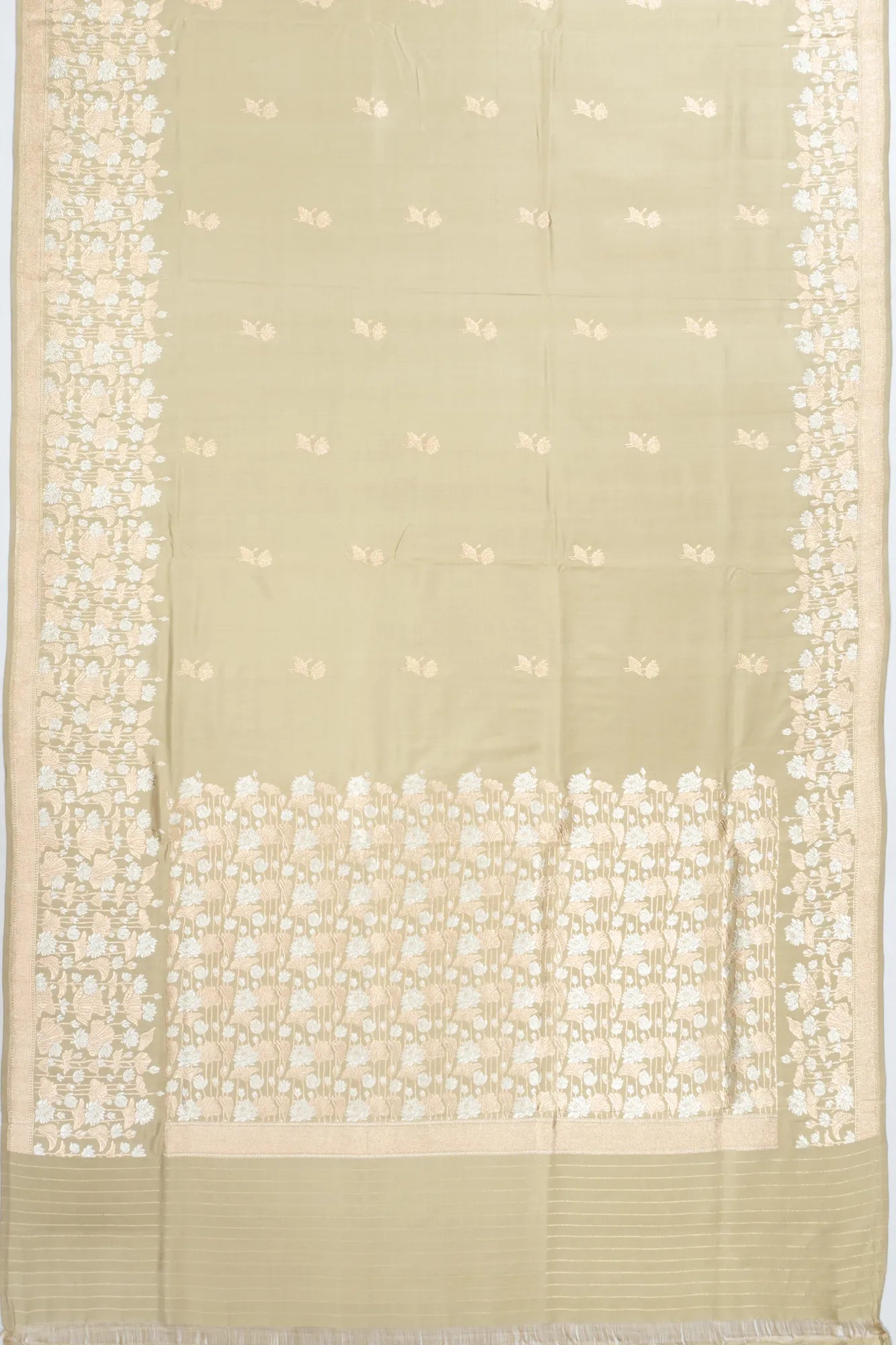 The pista green body is adorned with gold zari floral buttas and gold-silver floral vines on the pleats, adding depth and gentle grandeur.